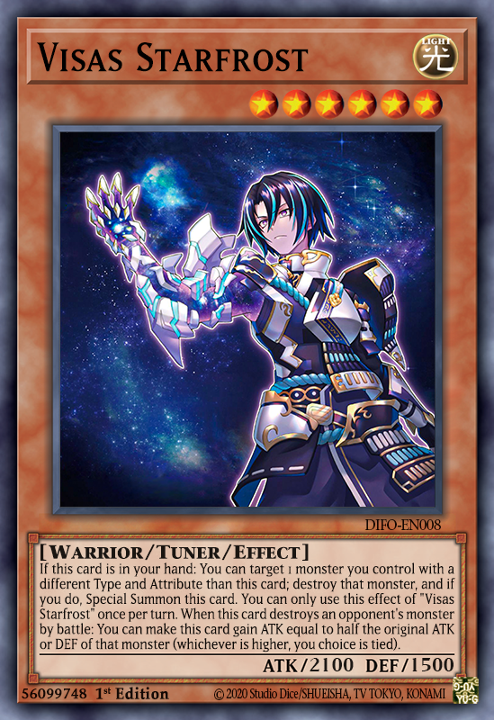 Visas Starfrost sẽ là một lá bài quan trọng trong thời gian tới, giống như Fallen of Albaz. Nó là một Quái thú Warrior Level 6 và là một Tuner. Người chơi có thể tiêu diệt một quái thú đang điều khiển đang sở hữu tộc và hệ khác với Visas để triệu hồi đặc biệt nó từ tay. Ngoài ra, nếu quái thú với 2100ATK này tiêu diệt quái thú của đối thủ trong trận chiến, Visas có thể nhận vĩnh viễn một nửa sức tấn công và phòng thủ ban đầu của quái thú đó, tùy theo bên nào cao hơn. Sẽ có một vài Archetype khác đánh xoay quanh lá bài này, vì vậy người chơi nên chú ý tới nó.