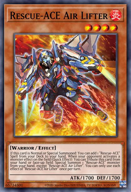 Rescue-ACE Air Lifter là quái thú triệu hồi thường mạnh mẽ nhất của tộc bài này cho phép tìm kiếm một ma pháp bất kì của R-Ace lên tay khi được triệu hồi. Thông thường bạn sẽ lấy EMERGENCY! để tối ưu khả năng set-up sân đấu của mình hoặc Rescue-ACE HQ để có thêm lượt triệu hồi thường cũng như khả năng hồi lại tài nguyên sau những lượt combo của mình. Nó cũng có thể phản ứng lại với hiệu ứng quái thú của đối thủ bằng cách tự hiến tế bản thân và triệu hồi một R-Ace từ trên tay lên sân đấu.