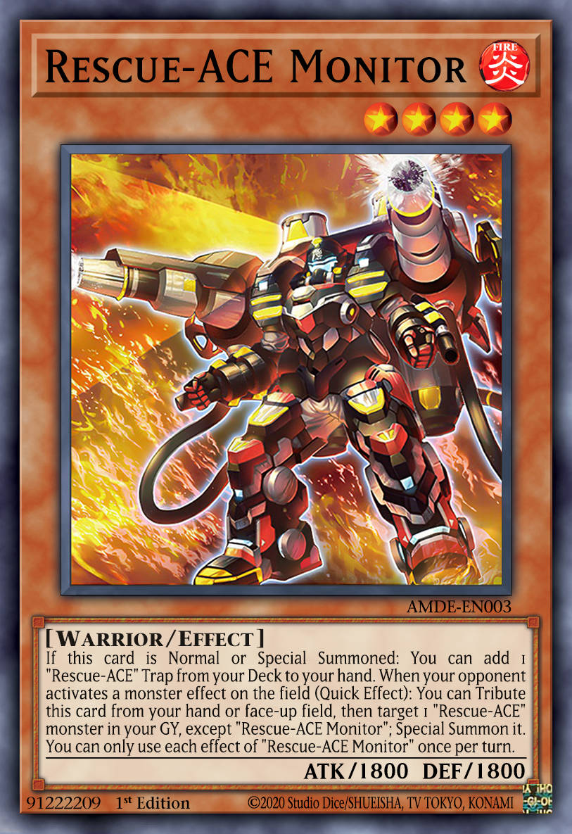 Tiếp đến là Rescue-ACE Monitor, đáng buồn đây là quái thú bạn sẽ không muốn sử dụng trong bộ bài. Hiệu ứng thứ nhất giúp tìm kiếm một lá bài bẫy của R-Ace và khi quái thú đối phương kích hoạt hiệu ứng thì nó có thể tự hiến tế bản thân trên sân hoặc tay để hồi sinh một quái thú Rescue-Ace từ dưới mộ. Hai hiệu ứng đều chỉ nằm ở mức trung bình và Rescue-ACE Air Lifter, Rescue-ACE Turbulence đều có thể làm tốt hơn rất nhiều so với nó.