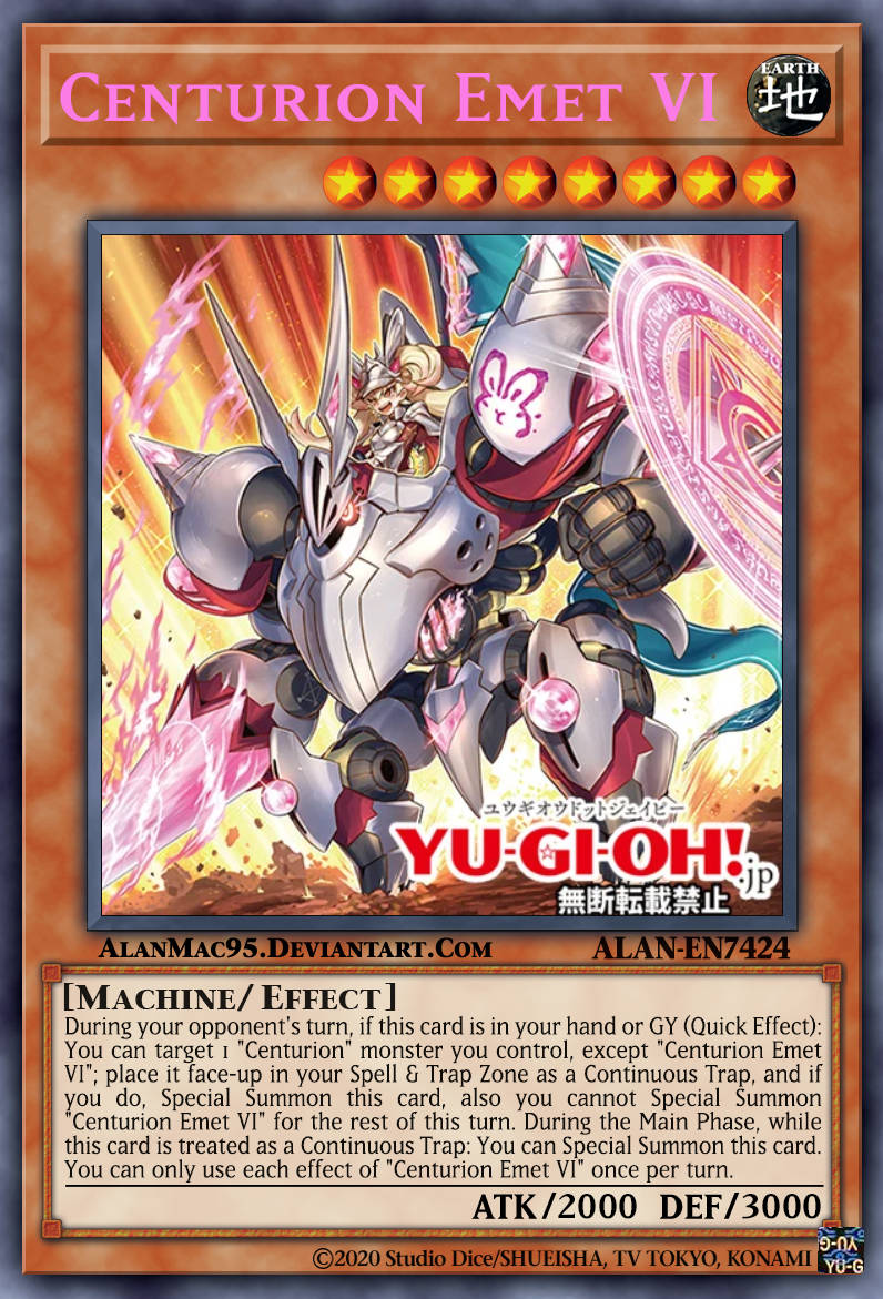 Tiếp đến, chúng ta có Centurion Emet VI. Đây là một quái thú cấp 8 có sức tấn công lên đến 2000 và 3000 phòng thủ. Cùng với Primera để tạo ra synchro level 12, và có 2 cách để triệu hồi.