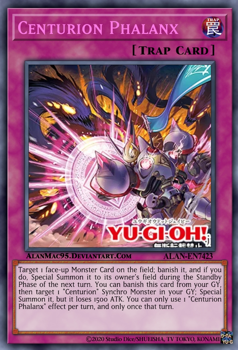 Lá bài cuối cùng chính là một normal trap Centurion Phalanx, thứ sẽ mang lại 2 hiệu ứng vô cùng mạnh mẽ. Kích hoạt trên sân cho phép bạn trục xuất bất kỳ lá bài quái thú ngửa trên sân, sau đó triệu hồi lại cho chủ sở hữu vào lượt Standby tiếp theo. Nó có thể được dùng để bảo vệ các Centurion của bạn khỏi bị loại bỏ dưới dạng quái vật hoặc bẫy của chúng, đồng thời nó cũng có tác dụng gây gián đoạn cho đối thủ của bạn. Ví dụ: sử dụng Centurion Phalanx để làm gián đoạn việc triệu hồi link và trả lại ở lượt tiếp theo sẽ không quá ảnh hưởng khi họ không thể làm gì với nó. Nếu sử dụng nó lên chính Centurion Legatia của bạn, và khi nó được triệu hồi đặc biệt ở lượt tiếp theo sẽ kích hoạt hiệu ứng rút bài và tiêu diệt một quái thú. Nếu bằng cách nào đó bạn đã đặt Legatia vào vùng phép/bẫy của mình (có thể thông qua Emet VI) thì Phalanx là phương pháp chính để đưa nó trở lại cuộc chơi.
