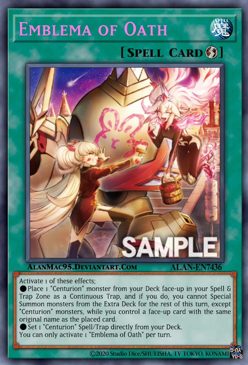 Centurion còn có một công cụ tìm kiếm khác ở dạng Quick-play spell, Emblema of Oath. Về mặt lí thuyết lá bài này không được coi như là một Centurion vậy nên bạn sẽ không thể tìm kiếm nó thông qua Primera. Cho dù như vậy, vẫn là một lá bài quan trọng cho tộc Centurion với 2 hiệu ứng vô cùng mạnh.