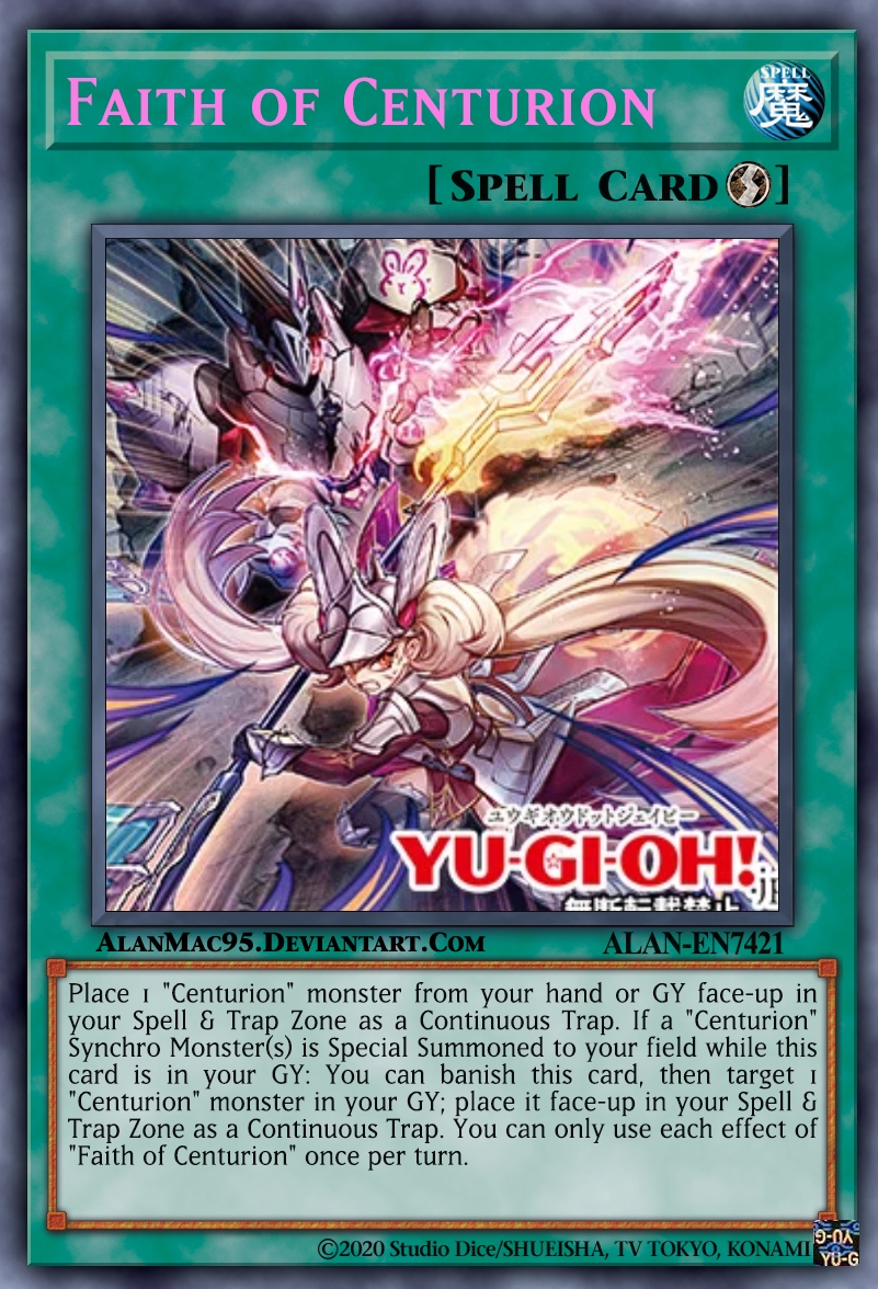 Faith of Centurion là một quick-play spell với hiệu ứng khá đơn giản cho phép đặt quái Centurion từ tay hoặc mộ vào vùng phép/bẫy và nếu một quái thú synchro Centurion được triệu hồi khi lá bài này ở dưới mộ banish chính nó để đặt một quái Centurion từ mộ vào ô Spell/trap. Cung cấp khả năng phục hồi tài nguyên để có thể chiến đấu dài hơi hơn.