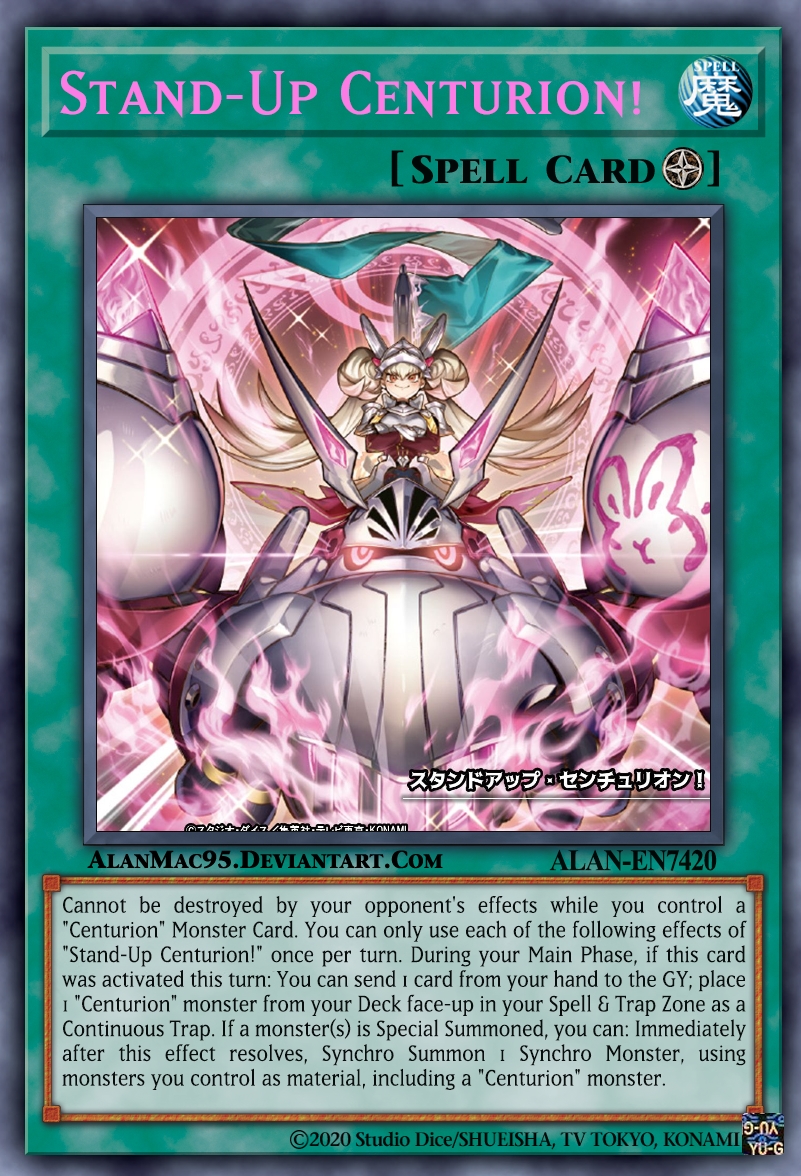 Stand-up Centurion là một ma pháp môi trường chủ lực, có 3 hiệu ứng quan trọng. Đầu tiên, không thể bị tiêu diệt khi đang điều khiểu thẻ bài quái thú Centurion. Chú ý với cụm thẻ bài quái thú (monster card) vì các quái thú của Centurion luôn được coi là một lá bài bẫy khi ở dàn sau của sân đấu