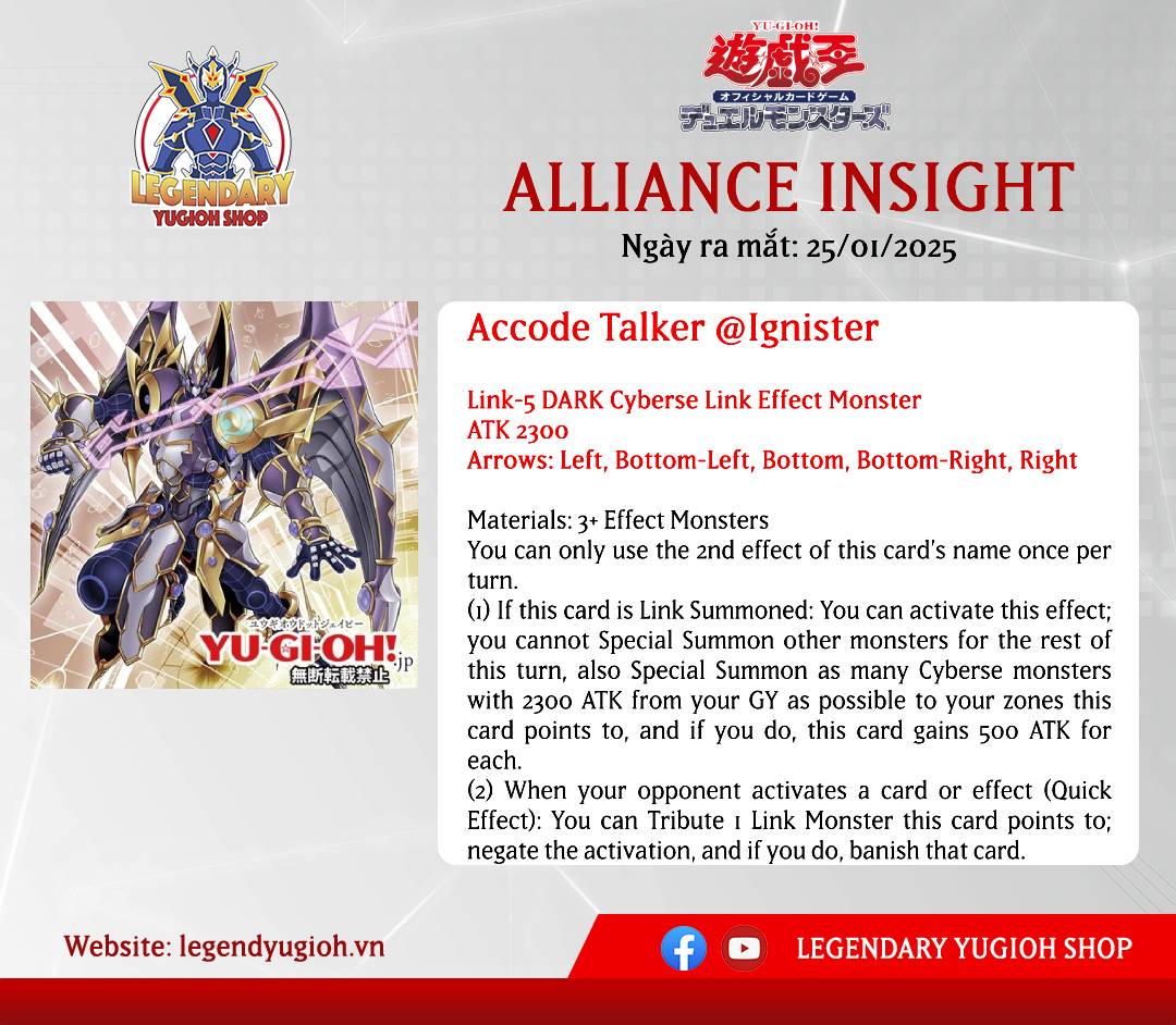 Bộ bài @Ignister nhận 9 lá bài mới với các effect đúng đặc trưng của dòng bài Cyberse nói chung. 2 Main monster Wizard và Backup đều là những extender siêu hạng, biết tự triệu hồi và kéo đồng đội, rất phù hợp cho việc thực hiện climb Link. Boss Link 5 mới Accode không chỉ là một Soul Charge on summon mà còn là omni negate chứ không còn là bị thịt như Arrival. Spell TA.I.es cũng có effect dã man không kém: Gọi 1 từ tay và search 1 mới, rất phù hợp với Deck đa hệ như @Ignister nhưng không phải Deck Cyberse nào cũng có thể dùng được.