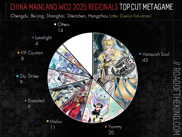 Chengdu, Beijing, Shanghai, Hangzhou và Shenzhen được chơi Duelist Advance, ngay lập tức chúng ta thấy tầm ảnh hưởng của Vanquish Soul lên metagame. Bộ 3 Yummy, Dracotail và Maliss phải chịu xếp sau K9 Vanquish Soul, chiến thuật chiếm tới 7/15 deck dẫn đầu. Ngoài ra, Sky Striker và Lunalight mỗi deck chiếm 1 slot, cho thấy có thể là kẻ ngáng đường bất cứ lúc nào.
