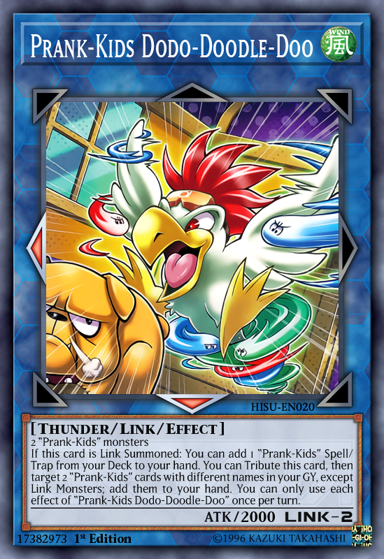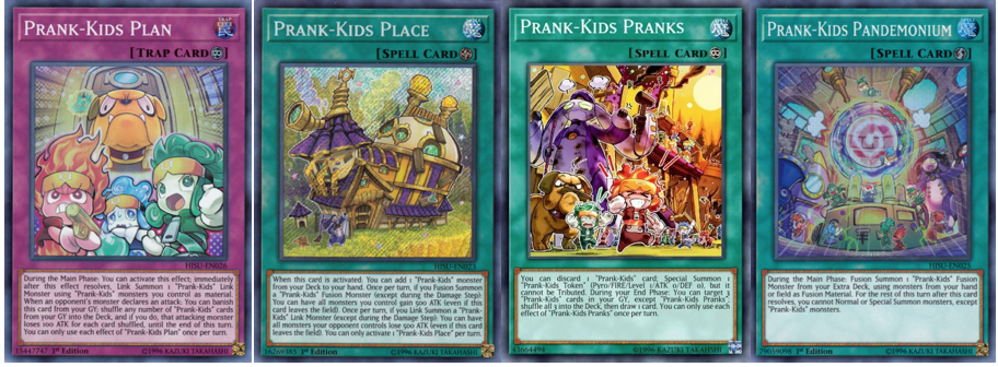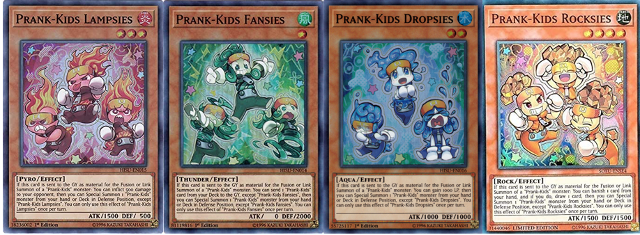 - Prank-Kids monster trong main deck đều có chung effect: khi được dùng làm nguyên liệu link summon hoặc fusion summon thì sẽ special summon 1 Prank-Kids khác từ trong maindeck