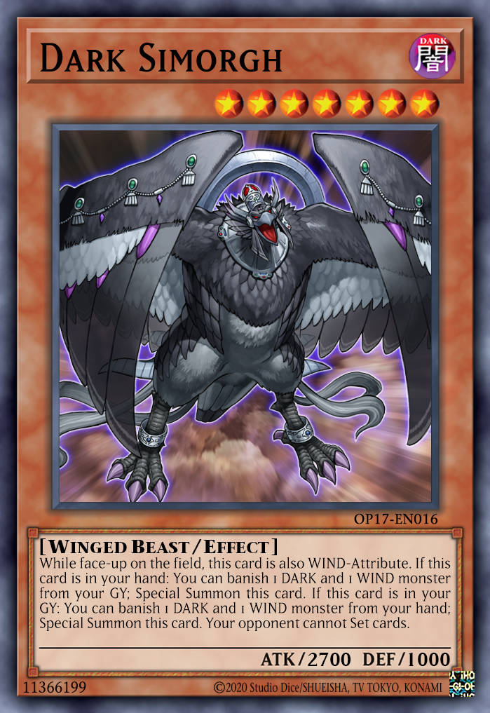 Dark Simorgh, với hiệu ứng ngăn không cho đối thủ úp bài chính là lựa chọn hoàn hảo sử dụng trong side deck để khắc chế các bộ bài bẫy như Labyrinth, Eldlich,... hay bộ bài đang thuộc top Meta - Unchained.