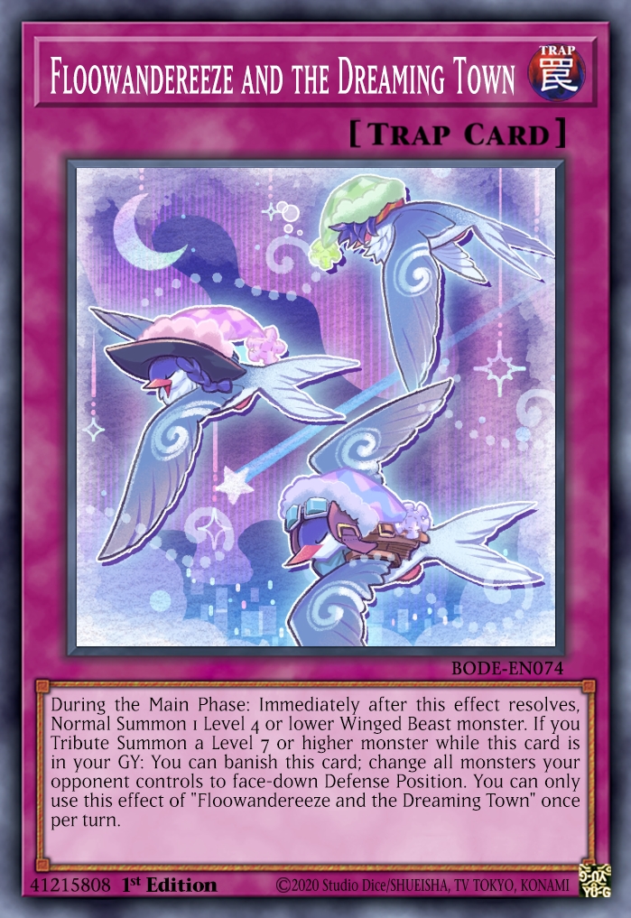 Gia tăng thêm sự khó chịu, Floowandereeze and the Dreaming Town sẽ cho phép bạn normal summon một quái thú Winged Beast cấp 4 trở xuống, sẽ chủ động hơn rất nhiều so với Floowandereeze and the Magnificent Map. Thêm vào đó, khi có quái thú Winged Beast cấp 7 hoặc cao hơn được triệu hồi bạn có thể banish lá bài này ở dưới mộ để úp mặt toàn bộ quái thú của đối thủ sẽ vô cùng khó chịu, điều này giống như tác động của Book of Eclipse nhưng có thể tìm kiếm được qua Effect của Empen.