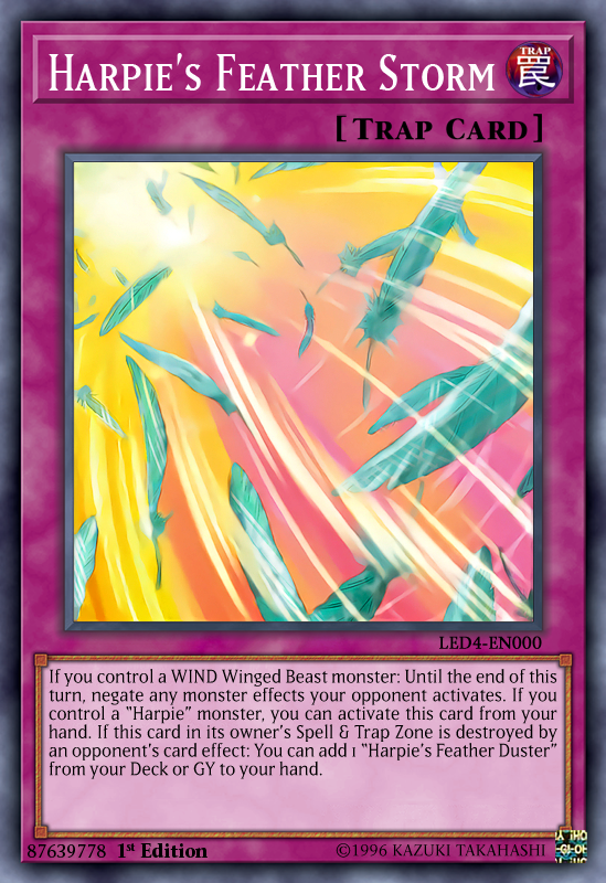 Harpie's Feather Storm một lá bài bẫy vô cùng mạnh khi sử dụng trong bộ bài Floowandereeze với khả năng vô hiệu hóa toàn bộ hiệu ứng quái thú của đối thủ khi ta điều khiển một quái thú Winged Beast hệ gió và chính là sự kết thúc cho họ. Ta có thể add lá bài này lên tay thông qua Triple Tatics Thrust..