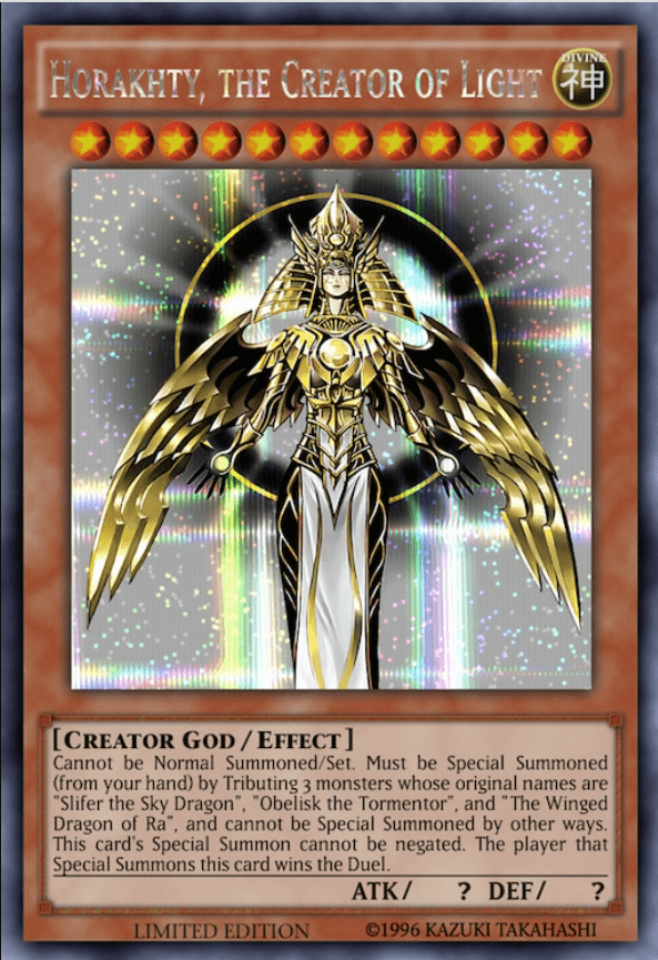 Nếu tam thần Ai Cập ở trên sân, người chơi có thể hiến tế cả 3 để triệu hồi Đấng Sáng Tạo (Creator God) độc nhất vô nhị: Horakhty, the Creator God of Light. Lá bài này chỉ có ở format OCG.