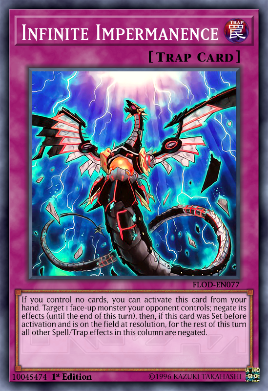 Infinite Impermanence là một trong số ít những handtrap mà Phantom không thể ngăn chặn được. Target chính của Infinite là Dark Beckoning Beast, Samsara D Lotus, Spirit of Yubel (khá rủi ro vì có thể đối thủ cầm Squirmer hay Sharvara), Fiendsmith’s Sequence hay Muckraker. Ngoài ra, Infinite còn có thể dùng để negate Phantom, sau đó sử dụng những handtrap khác như Nibiru hay Bystials.