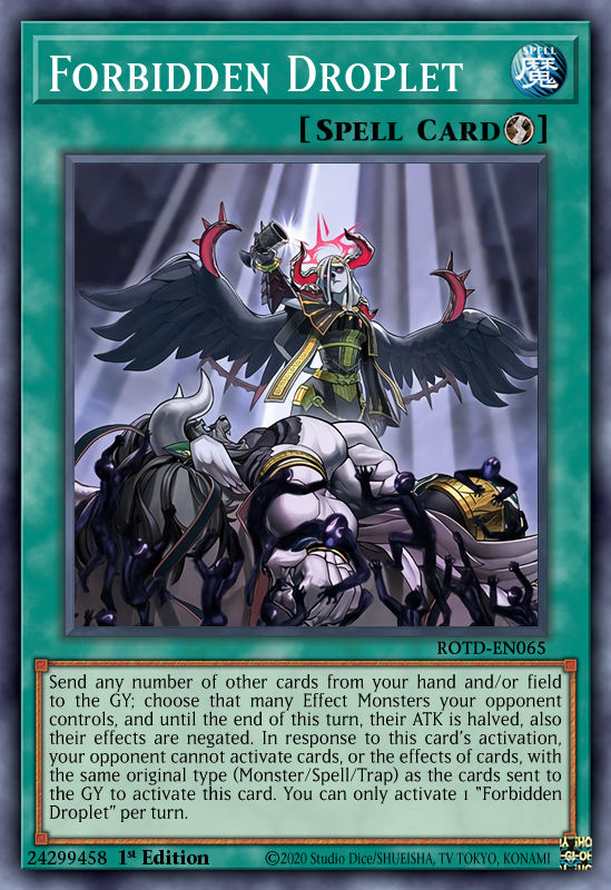 Một trong những boardbreaker khá mạnh khi đối đầu Yubel bởi có thể negate nhanh cả field và khó bị response. Tuy nhiên, Yubel vẫn có thể “lách luật" bằng cách chain Trap (Abominable Chamber) rồi chain Desirae chỉ Droplet. Khi ấy gần như là endgame bởi đối thủ còn nguyên disrupt còn chúng ta bị trừ rất nhiều bởi Droplet. Vì vậy, Droplet chỉ thật sự mạnh khi đối thủ không có Desirae/đã bị bait hoặc send Trap làm cost.