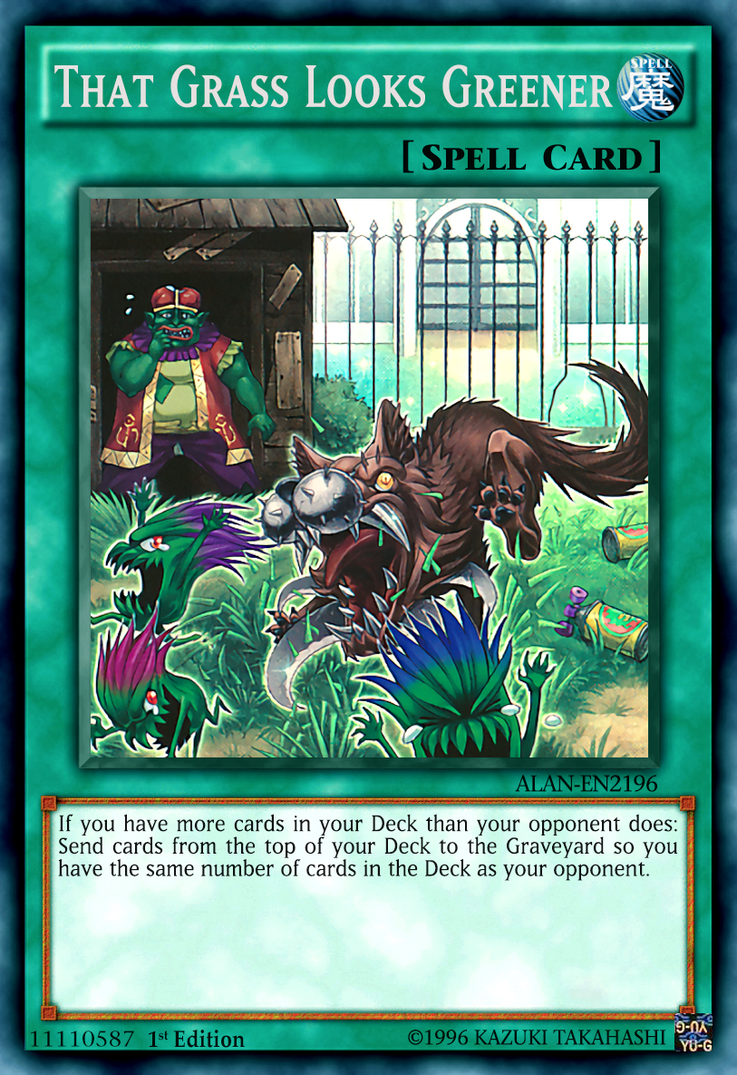 Chủ bài That Grass Looks Greener một khi resolve thành công thì cầm đến 90% chiến thắng. Do mới được thả chỉ có 1 nên cần nhiều cách search như Left Arm Offering hay Triple Tactics Thrust.