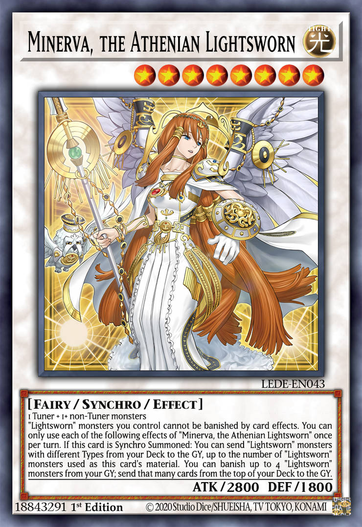 Minerva XYZ đã mạnh rồi Minerva Synchro còn mạnh hơn rất nhiều nữa. Khả năng của Minerva Athenian cho phép send đến 2 Lightsworn từ Deck, mà điểm chung của các Lightsworn đều có khả năng tự nhảy lên, bao gồm cả những Felis hay Wulf, từ đó có free thêm 2 body để extend combo.