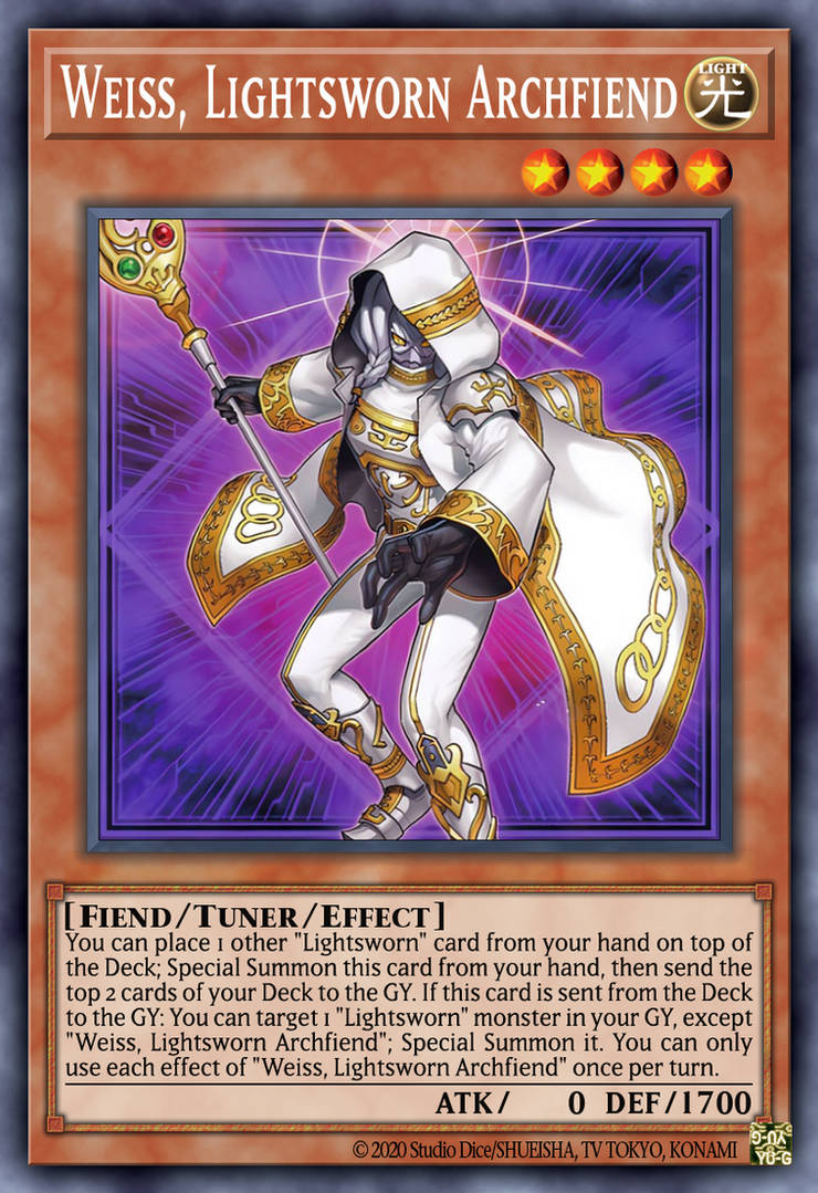 Weiss cũng có khả năng tương tự, biết tự nhảy và có thể gọi thêm body khi được send xuống GY, nhưng quan trọng nhất Weiss là một Light Fiend, đây chính là cây cầu dẫn tới Fiendsmith của riêng Lightsworn.