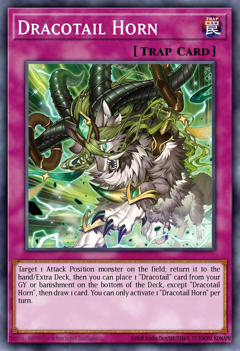Nếu có effect tương tự Book of Moon làm sấp mặt target của Horn, target đó vẫn sẽ bị đẩy về tay và vẫn sẽ được return Dracotail để draw. Nếu Horn bị mất target (ví dụ bởi Droplet), lá bài sẽ resolve without effect, và không thể return Dracotail về để draw. Nếu target của Horn không được đẩy về tay/Extra (ví dụ K9 Lupis bị banish khi rời sân), không thể return Dracotail về để draw.