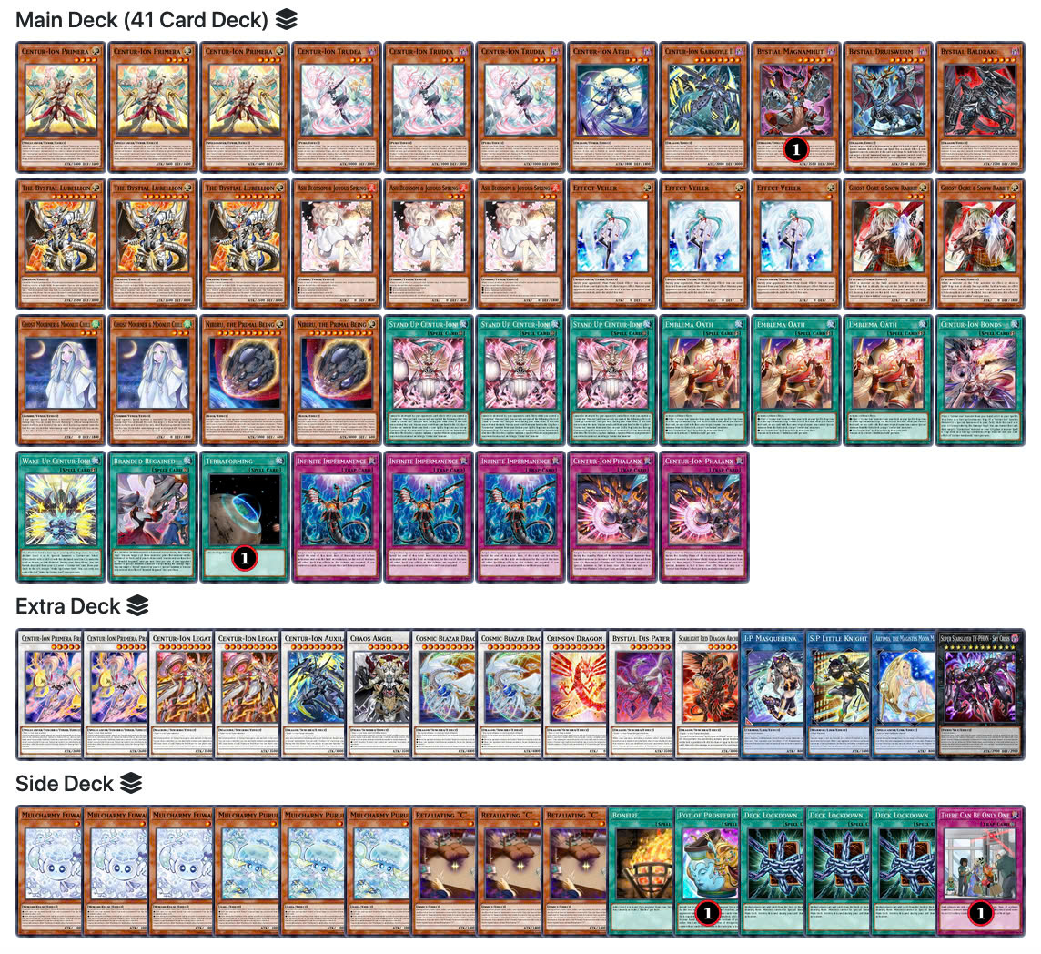 Với rất nhiều starter, extender, combo của Centur-Ion là rất ổn định, luôn dễ dàng setup ra các boss Lv12. Lượt triệu hồi ít, không phụ thuộc vào việc search bài nên gần như không ảnh hưởng bởi Fuwalos, Purulia, Droll hay Nibiru. Có thể chơi qua Shifter với Bonds và Auxila, thậm chí là Main handtrap này. Combo ít card nên chơi được rất nhiều handtrap, sau Side Deck có thể có tới 25 handtrap để hoàn toàn phá lối chơi đối thủ.