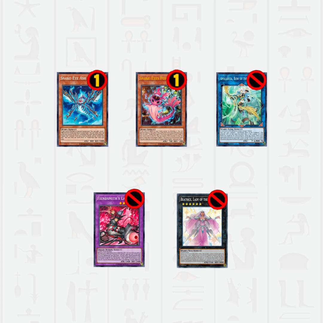 - Cánh tay phải đắc lực Fiendsmith cũng bị phế không thương tiếc, banned Lacrima và Beatrice khiến chiến thuật mất hoàn toàn các phương án extend cũng như backup khi ăn handtrap.