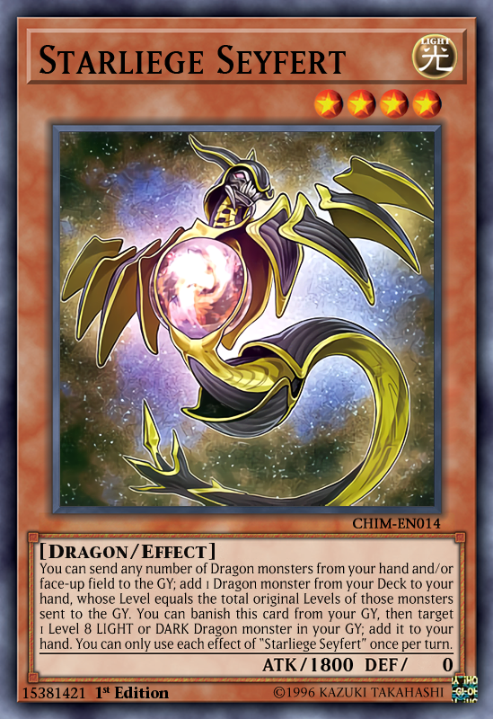 Starliege Seyfert là một Triệu hồi Bình thường xuất sắc cho bộ bài, đặc biệt là vì nó là một quái thú hệ Light và kết nối các quái thú của bộ bài lại với nhau. Thông thường thì đây là hai cách chơi phổ biến mà người chơi có thể thực hiện với nó, gồm có gửi chính nó từ Field xuống GY để thêm Black Dragon Wyverbuster hoặc gửi Absorouter Dragon để lấy Noctovision. Cả hai hướng đi đều là hợp lệ và rất khó để cho đối thủ phản ứng ngoài Droll & Lock Bird. Nó còn giúp người chơi kết hợp tốt với PSY-Framegear Gamma để bait Handtrap của đối phương. Cuối cùng nhưng không kém phần quan trọng, khả năng tái chế những thứ như Chaos Dragon Levianeer là một khía cạnh không thể bỏ quên trong khả năng của Seyfert. Levi là một vũ khí tuyệt vời cả đi trước và đi sau, và thậm chí còn có thể kết hợp với Chaos Ruler để triệu hồi những các quái thú như The Zombie Vampire.
