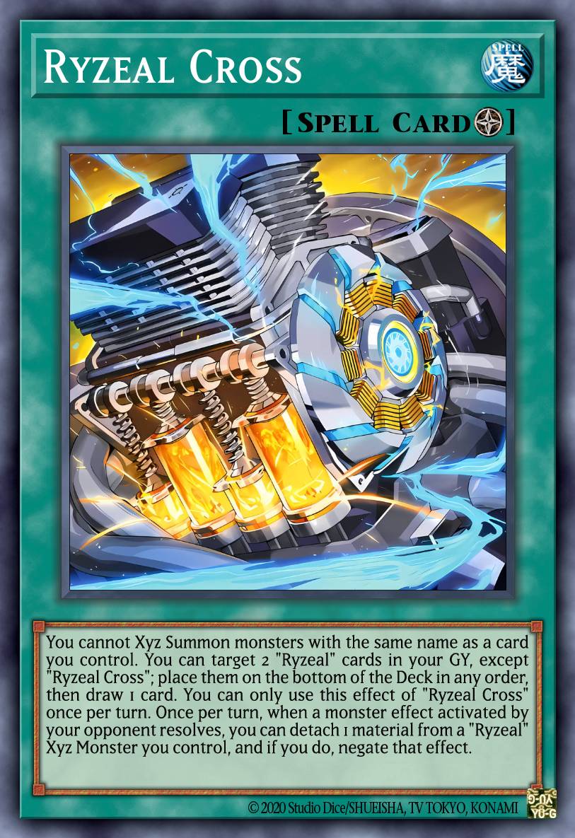 Field Spell Cross là một trong những lá bài “chấp” cả ruling của Ryzeal. Khả năng negate monster effect của Cross thật sự rất broken và gần như không có cách play around. Nói ngắn gọn thì Cross có thể negate mà không cần kích hoạt (negate ở resolution) bất kỳ effect nào trong chain link (không nhất thiết phải là chain cao nhất) và có thể sử dụng ở Damage Step. Không chỉ vô hiệu hoá các handtrap khó chịu như Nibiru, Cross còn là disrupt, là lá chắn bảo kê cho những Detonator, Number 41,... Effect draw cũng rất hữu dụng khi có thể tái chế các XYZ, Spell Ryzeal đã qua sử dụng và luôn +1 mỗi turn. Tuy nhiên, cần nhớ restrict của Cross là không cho triệu hồi XYZ trùng tên trên sân, vì vậy cần phải có cách giải quyết những xác hết material.
