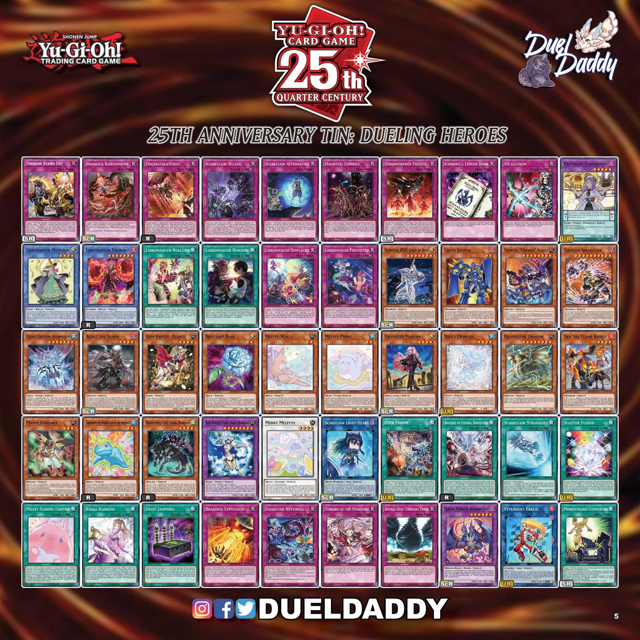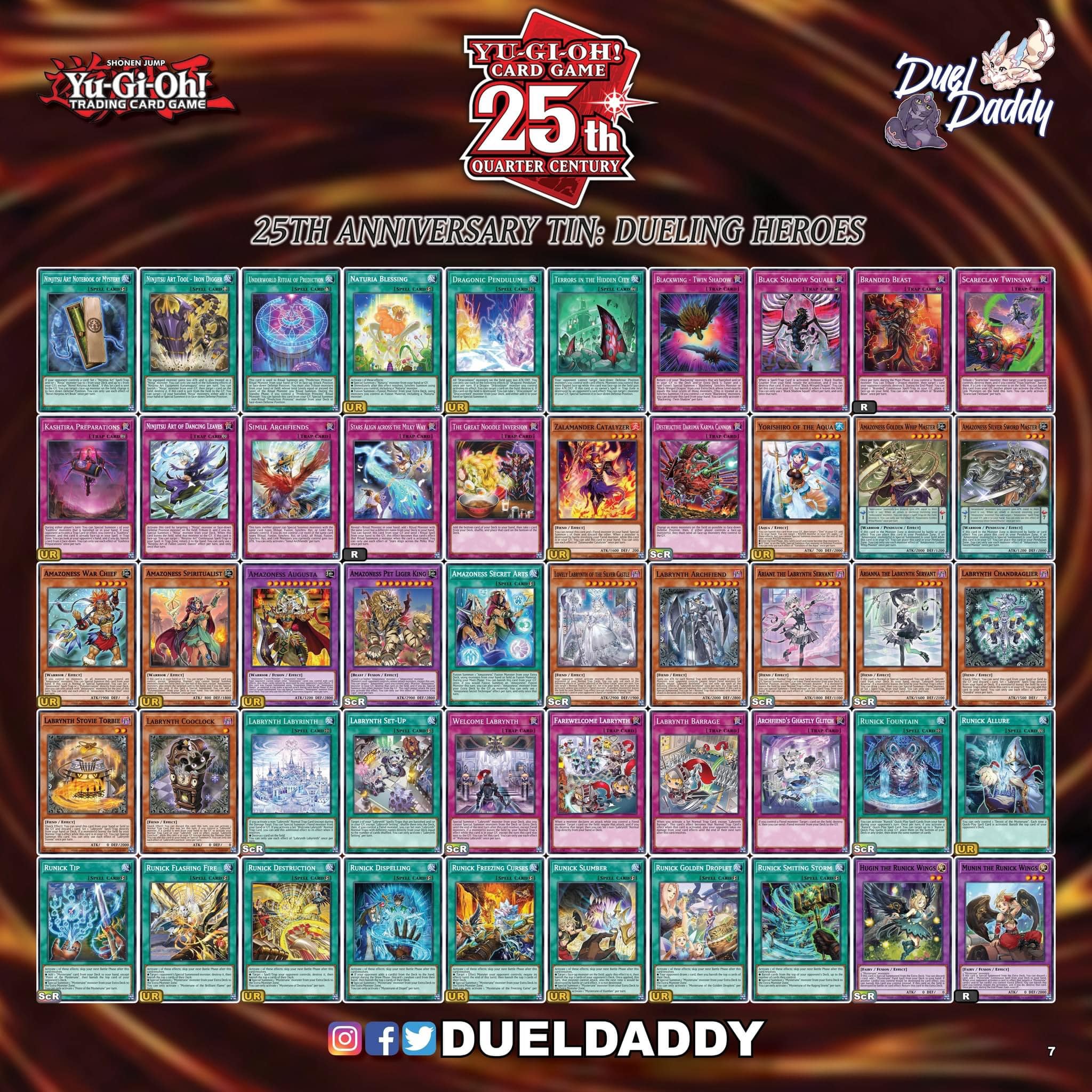Được sắp xếp gần như nằm giữa thời gian ra mắt của 2 sản phẩm Duelist Nexus và Age of Overlord, Tin: Dueling Heroes kỷ niệm 25 năm sẽ ra mắt vào đầu tháng 9: