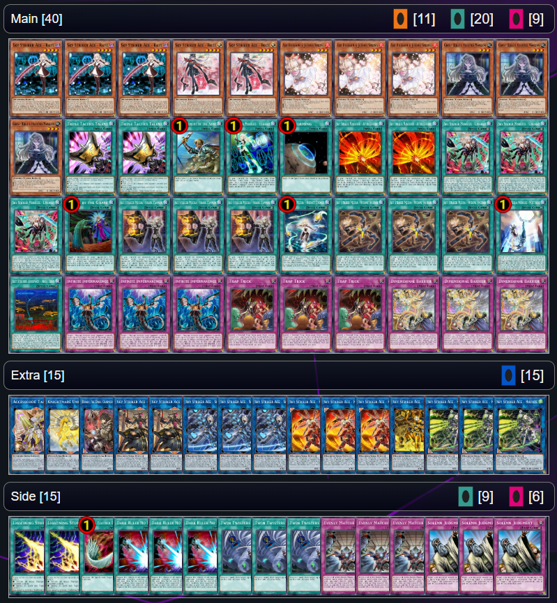 Bộ bài hiện tại vẫn cần dựa vào các lá bài như Dimensional Barrier để làm chậm đối phương xuống mức có thể đối phó được. Theo ý kiến của tôi, Sky Striker Mecha - Shark Cannon hiện bắt buộc phải chơi ba vì Tearlaments đang thống trị meta bây giờ. Tất nhiên, nếu có thêm Sky Striker Mobilize - Engage! thì bộ bài này sẽ mạnh hơn chút, tôi đoán trong một vài banlist nữa có thể Engage! sẽ được chuyển thành semi-limit.