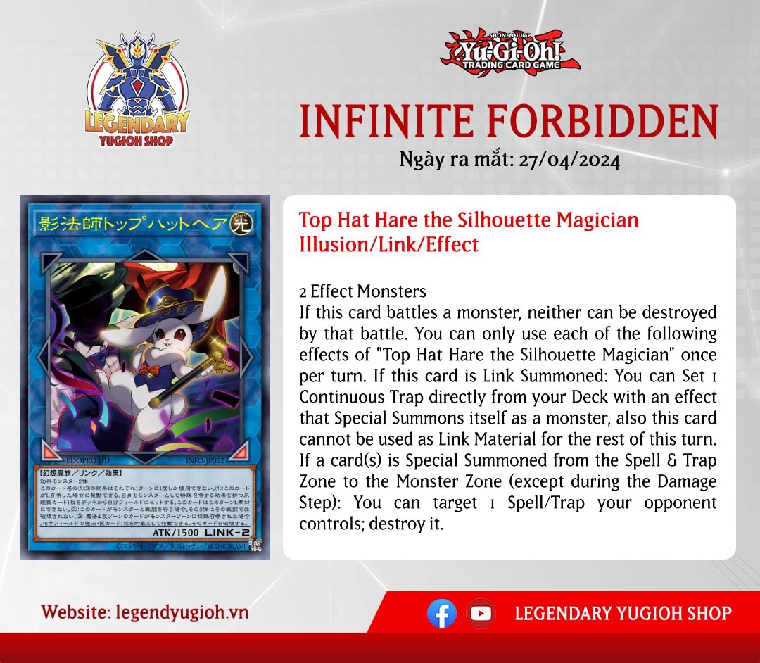 Bên cạnh engine đang làm mưa làm gió tại OCG là Fiendsmith, Infinite Forbidden còn mang đến một lá bài được sử dụng trong khá nhiều top deck thời gian qua là Top Hat Hare the Silhouette Magician. Sau khi được triệu hồi, khả năng của Top Hat Hare giúp bạn có thể set một Trap có hiệu ứng tự triệu hồi chính nó thành quái vật (Monster Trap). Các target chính của Top Hat Hare là Silhouhatte - lá Trap đi kèm trong INFO - có khả năng negate chỉ mặt số card của đối thủ bằng số quái thú Illusion của mình (kết hợp với Top Hat Hare thì có thể negate tới 2 card một lúc); hay Angel Statue – Azurune, lá Trap có khả năng gửi nó xuống mộ để negate summon một quái thú của đối thủ.