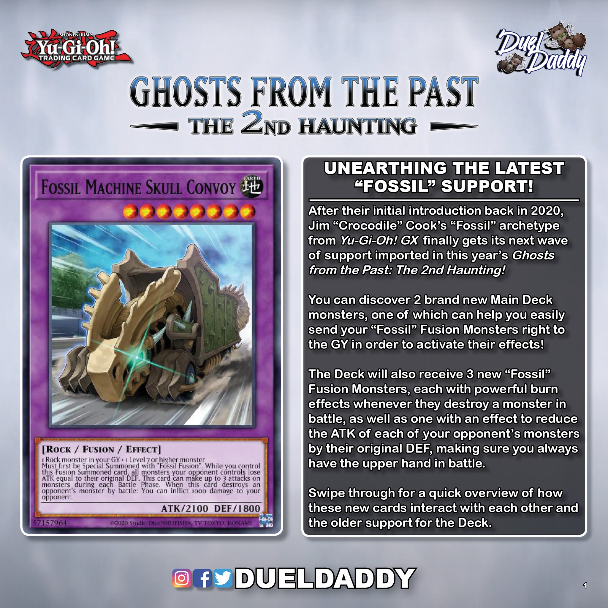 Sau lần đầu ra mắt năm 2020, Archetype Fossil của Jim "Crocodile" Cook trong Yu-Gi-Oh! GX cuối cũng cùng được nhận thêm những Support mới trong set Ghost From The Past 2 năm nay. Mang tới thêm hai quái thú mới cho Main Deck của người chơi, một trong đó còn cho phép người chơi dễ dàng gửi thẳng các quái thú Fusion Fossil từ Extra Deck xuống mộ đẻ kích hoạt khả năng của chúng, điều này hứa hẹn sẽ nâng tầm sức mạnh cho Archetype này. Không chỉ vậy, 3 quái thú Fusion mới cũng sắp được ra mắt, mang trong mình khả năng gây thiệt hại ấn tượng mỗi khi chúng tiêu diệt quái thú của đối phương trong chiến đấu, một trong số chúng còn có thể làm giảm sức công của quái thú địch đi bằng với sức phòng thủ gốc của chúng, mang lại lợi thế không nhỏ cho người chơi mỗi khi bước vào chiến đấu.