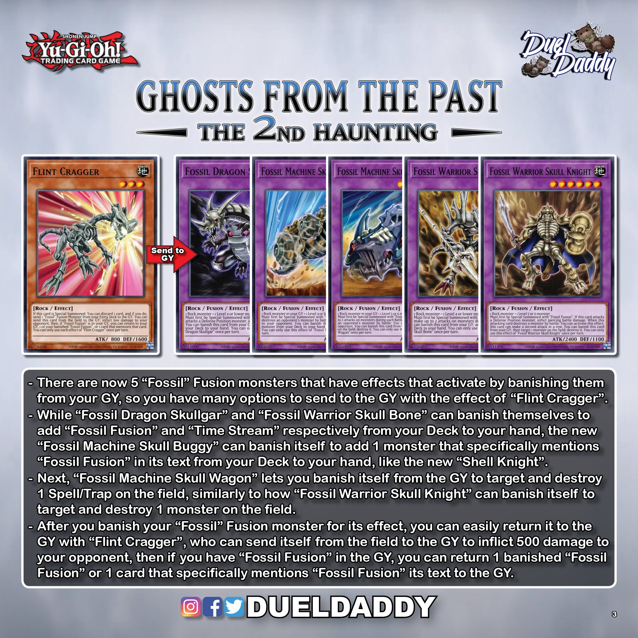 Sau khi kích hoạt khả năng của các quái thú Fusion Fossil trên, người chơi còn có thể trả lại chúng từ Banish zone về mộ dễ dàng với khả năng của Flint Cragger, kích hoạt khi lá bài trên được gửi từ sân xuống mộ, cho phép người chơi gây 500 điểm thiệt hại lên đối thủ, và nếu người chơi đang có một Fossil Fusion ở dưới mộ, người chơi có thể trả một Fossil Fusion hoặc một lá bài có nhắc đến Fossil Fusion từ Banish zone về mộ