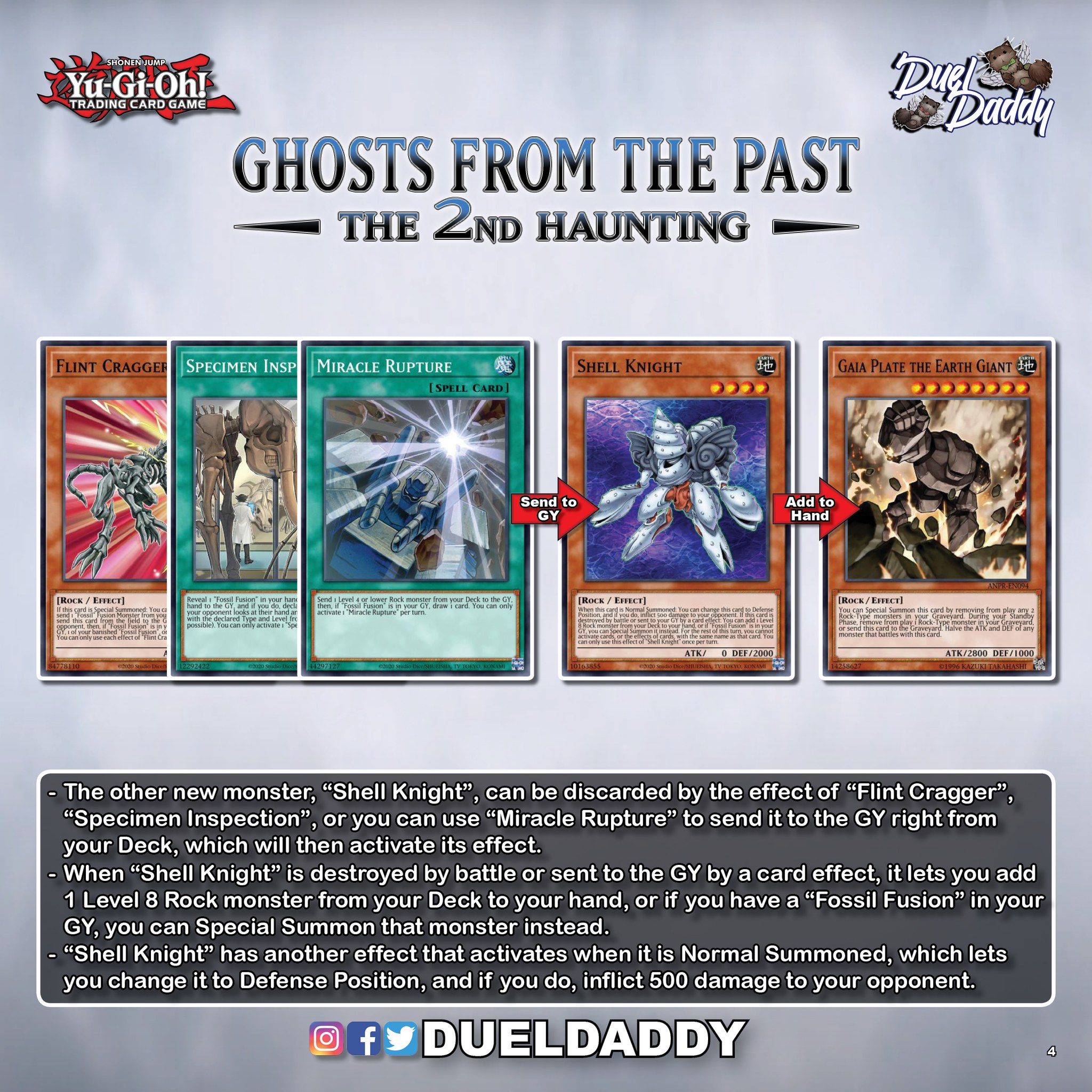 Quái thú mới còn lại Shell Knight là một lá bài tương tác rất tốt cho khả năng discard của Flint Cragger hoặc Specimen Inspection, hoặc người chơi có thể dùng Miracle Rupture để gửi thẳng lá bài trên từ Deck xuống mộ, tất cả các phương thức trên sẽ kích hoạt khả năng của Shell Knight, khi bị tiêu diệt trong chiến đấu hoặc bị gửi xuống mộ bằng khả năng đặc biệt, người chơi có thể add một quái thú level 8 hệ Rock từ Deck lên tay, hoặc nếu như người chơi đang có Fossil Fusion dưới mộ, thì còn có thể Triệu hồi đặc biệt thẳng quái thú đó.