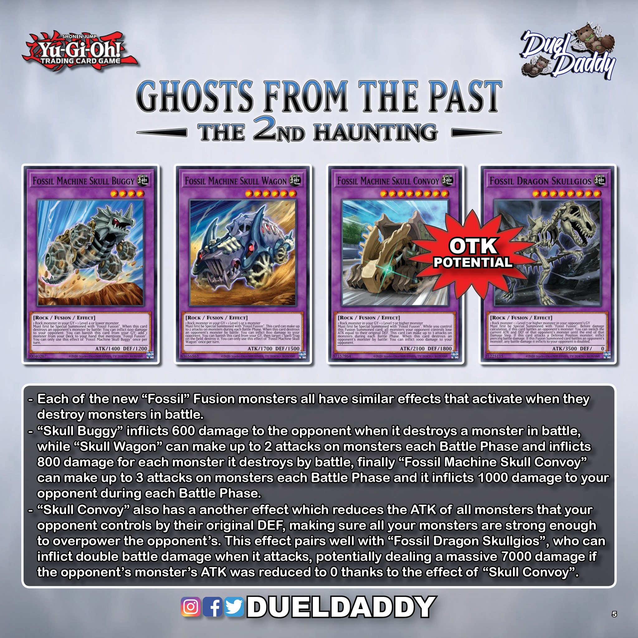 Các quái thú Fusion Fossil mới đều mang trong mình khả năng khá giống nhau được kích hoạt khi chúng tiêu diệt quái thú của đối phương trong chiến đấu. Skull Buggy gây 600 điểm thiệt hại khi tiêu diệt một quái thú trong chiến đấu, Skull Wagon có thể tấn công hai lần lên quái thú và gây tới 800 điểm thiệt hại mỗi lần tiêu diệt quái thú, và Skull Convoy có thể tấn công tới 3 lần lên quái thú và gây 1000 điểm thiệt hại mỗi Battle Phase.