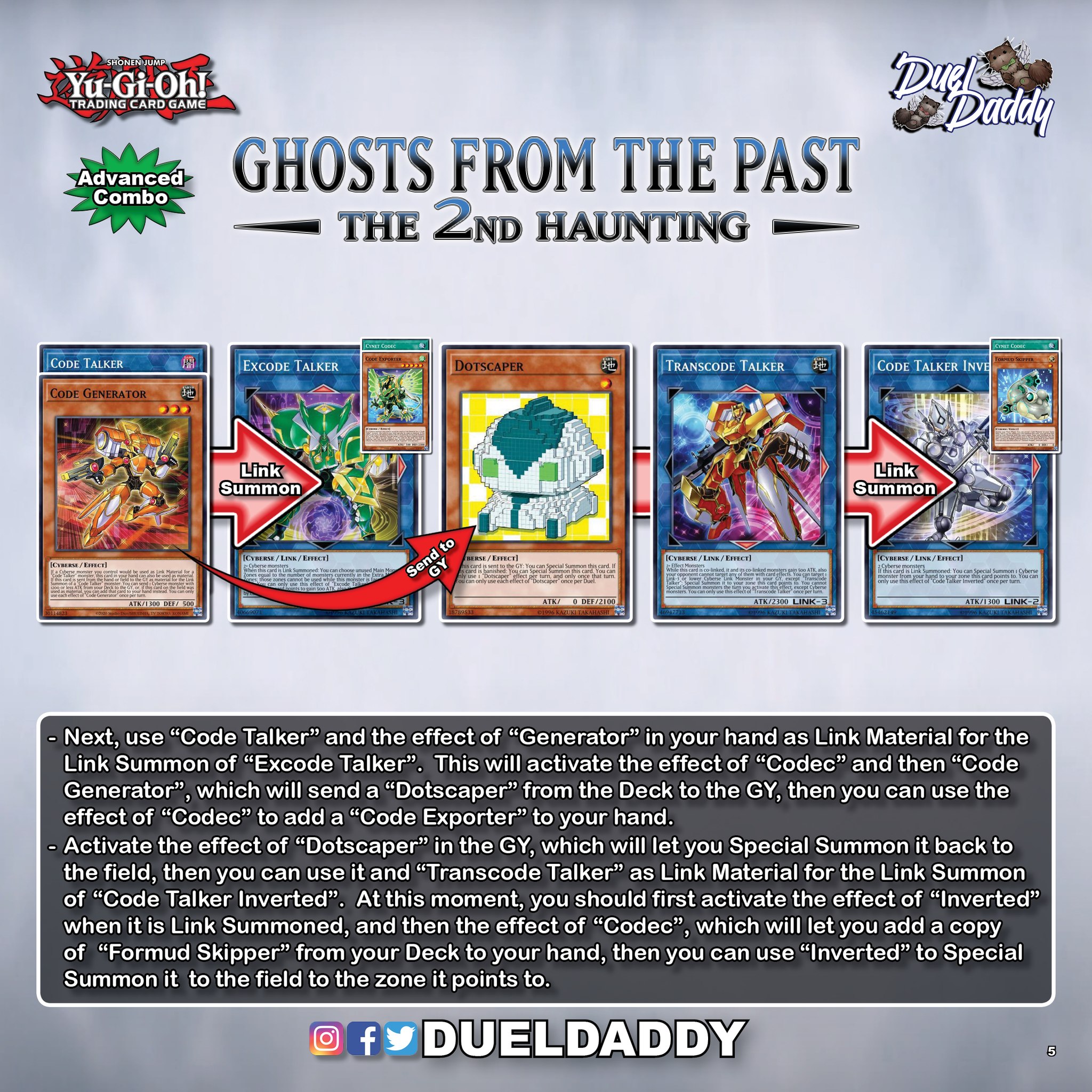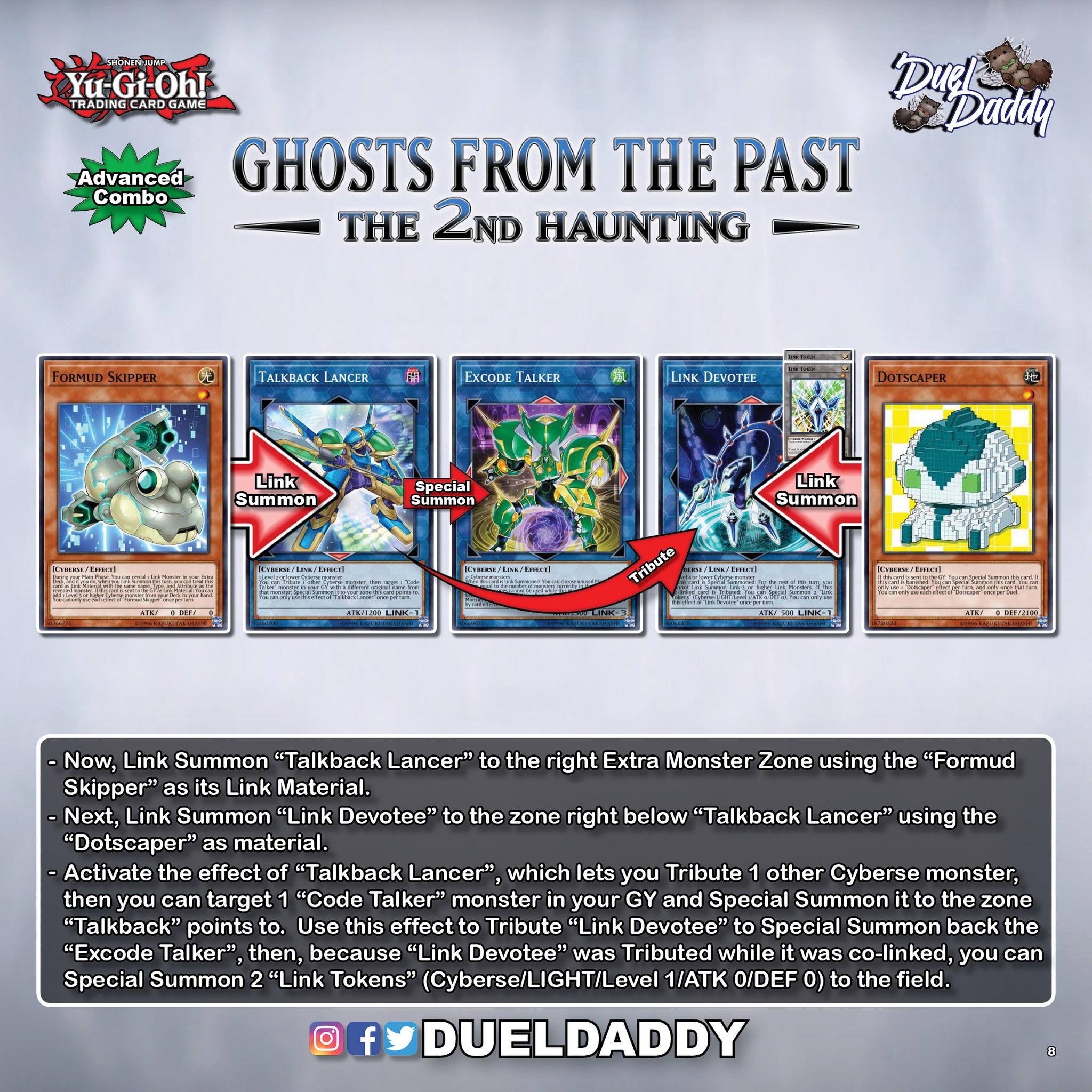 Bây giờ, triệu hồi Link Talkback Lancer tới Extra Monster Zone bên phải bằng cách sử dụng Formud Skipper làm nguyên liệu. Tiếp đó triệu hồi Link quái thú Link Devotee tới ô bên dưới Talkback Lancer bằng cách dùng Dotscaper làm nguyên liệu. Lúc này, kích hoạt khả năng của Talkback Lancer, hiến tế một quái thú Cyberse khác để triệu hồi một quái thú Code Talker từ dưới mộ vào ô Talkback chỉ vào. Người chơi sẽ hiến tế Link Devotee để triệu hồi lại Excode Talker, cũng như để kích hoạt khả năng của Link Devotee để triệu hồi đặc biệt 2 Tokens nếu Link Devotee được hiến tế khi nó đang co-linked (hai quái thú link cùng chỉ vào nhau)