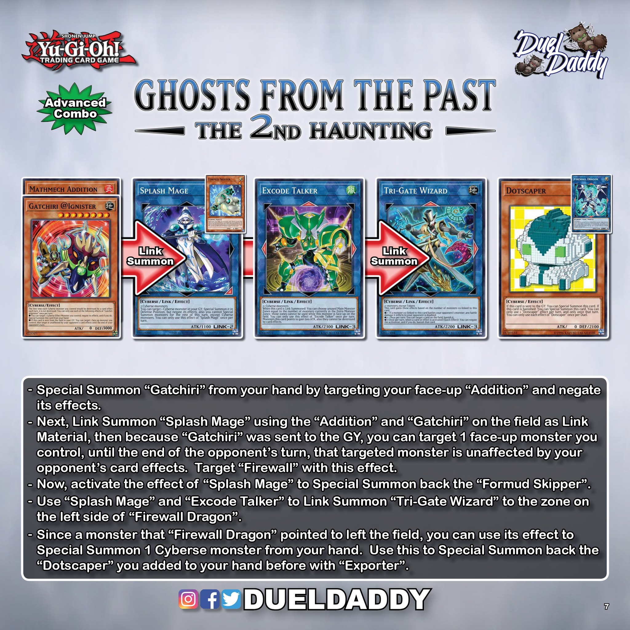 Tiếp đó, kích hoạt khả năng đặc biệt của Splash Mage để Triệu hồi Đặc biệt lại Formud Skipper ở dưới mộ, và dùng Splash Mage với Excode Talker để triệu hồi Link Tri-Gate Wizard lên ô bên trái của Firewall Dragon. Do lúc này một quái thú được Firewall chỉ vào vừa rời sân, nên Firewall sẽ kích hoạt khả năng để triệu hồi Đặc biệt một quái thú Cyberse từ tay người chơi, và trong tình huống này người chơi sẽ triệu hồi Dotscaper vừa được add lại về tay bằng Exporter.