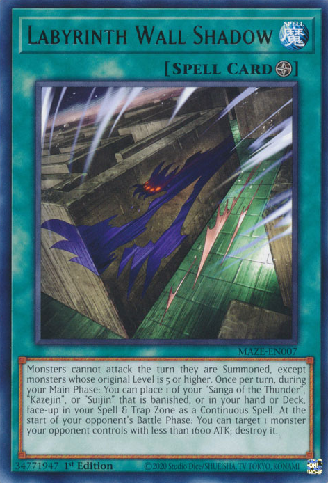 Lá bài cuối cùng là mục tiêu search của Ghoul và là nguyên nhân tại sao engine này tồn tại. Labyrinth Wall Shadow có một loạt các hiệu ứng khá khó chịu cho đối thủ của bạn. Đầu tiên, quái vật không thể tấn công vào lượt mà chúng được triệu hồi, trừ khi level của chúng là 5 hoặc cao hơn. Do đó, hiệu ứng này loại bỏ được các quái vật Link và XYZ. Ví dụ, bộ bài Spright Tri-Brigade không thể vượt qua "bệnh lười" này và sẽ phải chờ đến lượt tiếp theo để tấn công.