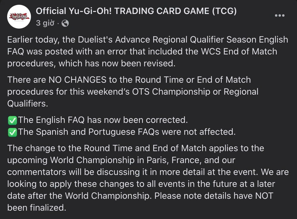 Tuy nhiên, chỉ ít giờ sau, Time Rules lại một lần nữa được sửa (về như cũ). Và đến sáng 30/7, Yu-Gi-Oh! TCG đã có thông báo chính thức: Luật End of Match mới sẽ CHỈ được áp dụng cho WCS 2025, và sẽ được xem xét để thay đổi hẳn Time Rules sau giải đấu này. Trước mắt, các giải đấu như OTS, Regional vẫn áp dụng luật như cũ.