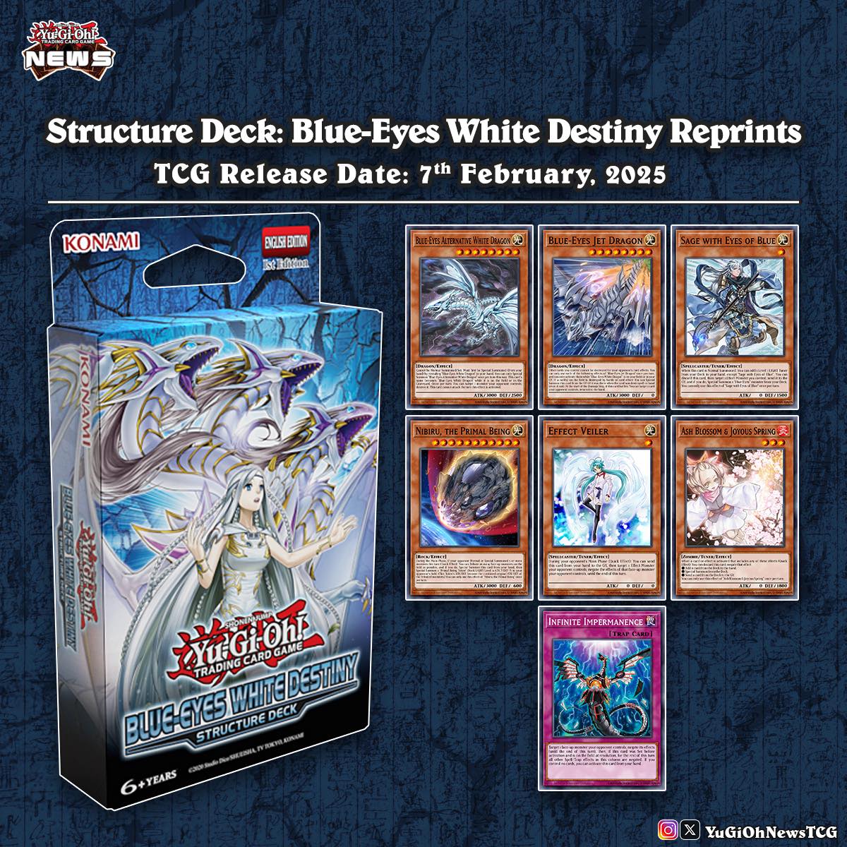 Những support cho binh đoàn Rồng Trắng Mắt Xanh đang làm mưa làm gió tại OCG chính thức ấn định ngày import sang TCG trong Structure Deck: Blue-Eyes White Destiny. Bên cạnh các nhân tố mới như Maiden of White, Roar of the Blue-Eyed Dragons hay Spirit with Eyes of Blue thì việc reprint các lá bài Blue-Eyes cần thiết và đặc biệt là toàn bộ dàn handtrap biến SD Blue-Eyes trở thành một SD ngon, bổ, rẻ.