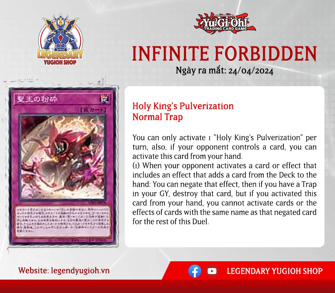 1 lá bài có tiềm năng trở thành 1 staple mới cực kì mạnh đã được ra mắt trong Infinite Forbidden. Với hiệu ứng là Xuân phiên bản Lite cùng với 1 restrict khá là nặng nếu bạn chẳng may dùng phải trong kèo Mirror Match hoặc các lá bài giống nhau. Liệu đây có thể là 1 lá bài Staple mới của metagame Yugioh? Cùng săn ngay Infinite Forbidden tại Legendary nhé.