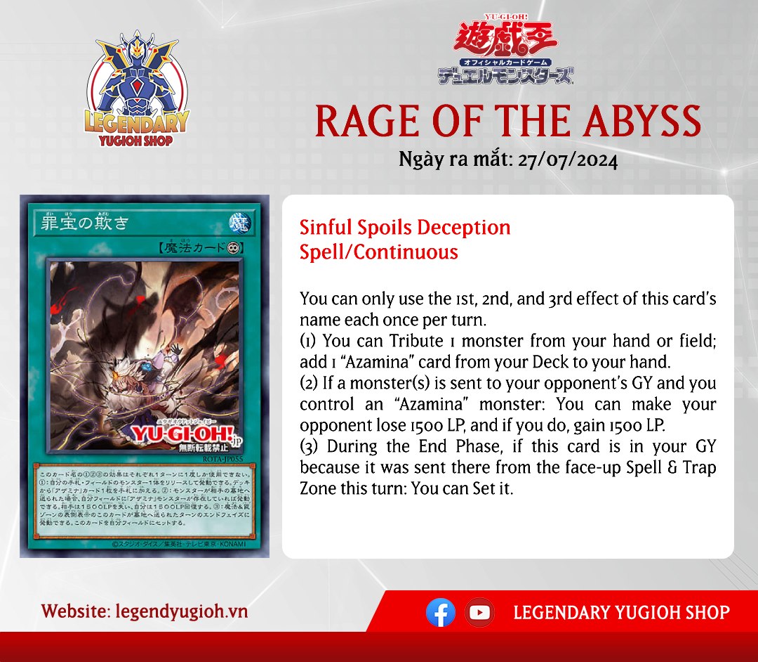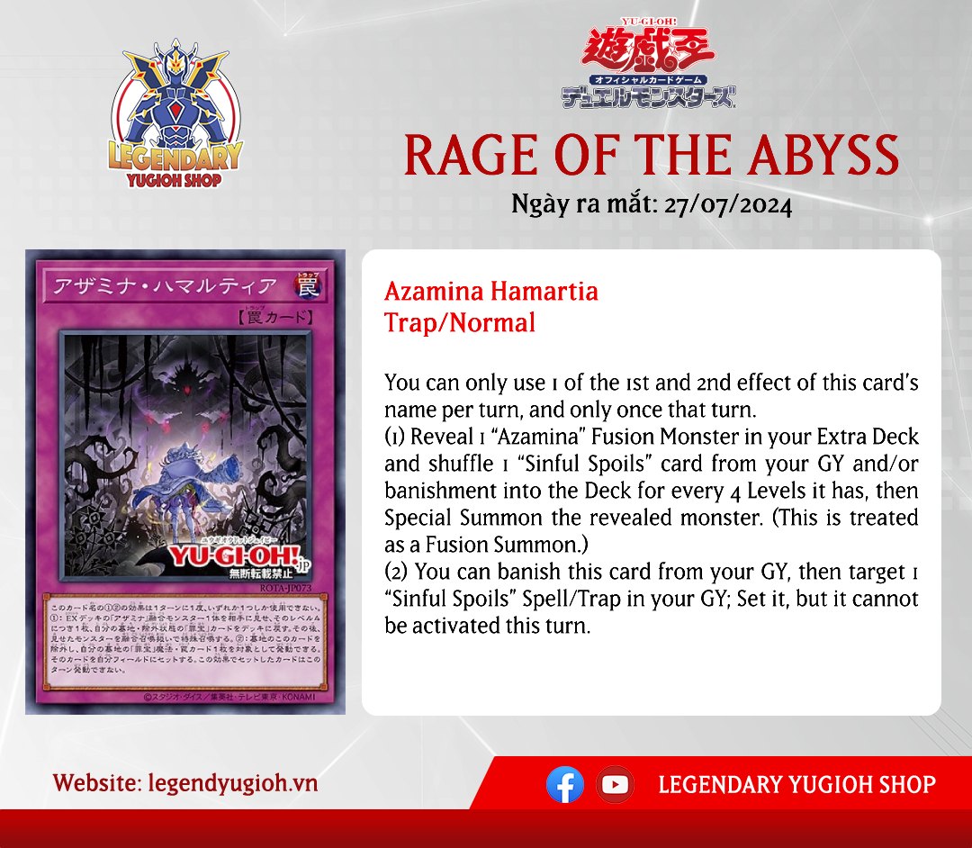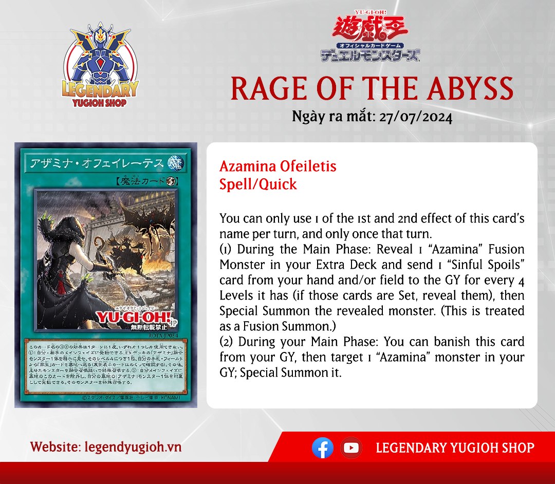 Tiếp tục là một archetype trong lore của Diabellstar, lần này là support trực tiếp cho Sinful Spoils. Các Azamina Spell biết gọi thẳng Azamina Fusion từ Extra bằng cách send Sinful Spoils từ tay/sân xuống Mộ. Các Azamina Fusion thì có thể search Azamina/Sinful Spoils hoặc biết disrupt như negate, bắn phá. Sinful Spoils có lẽ sẽ trở thành archetype chơi độc lập và hứa hẹn còn phát triển hơn nữa.