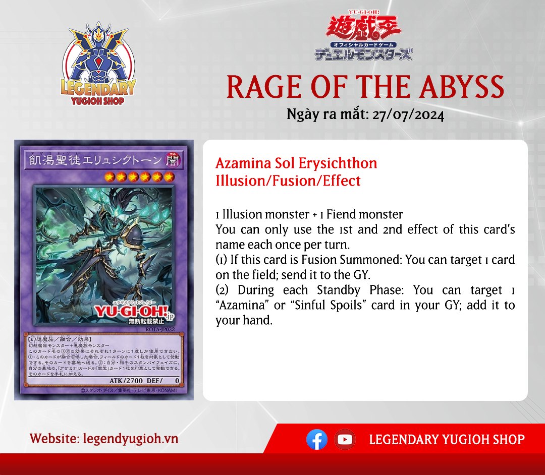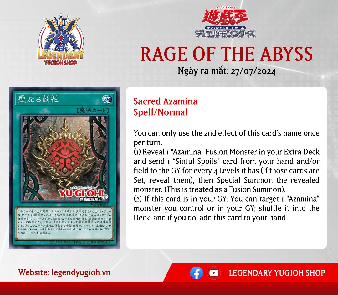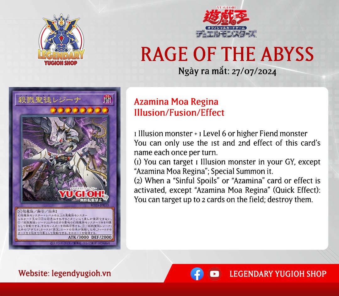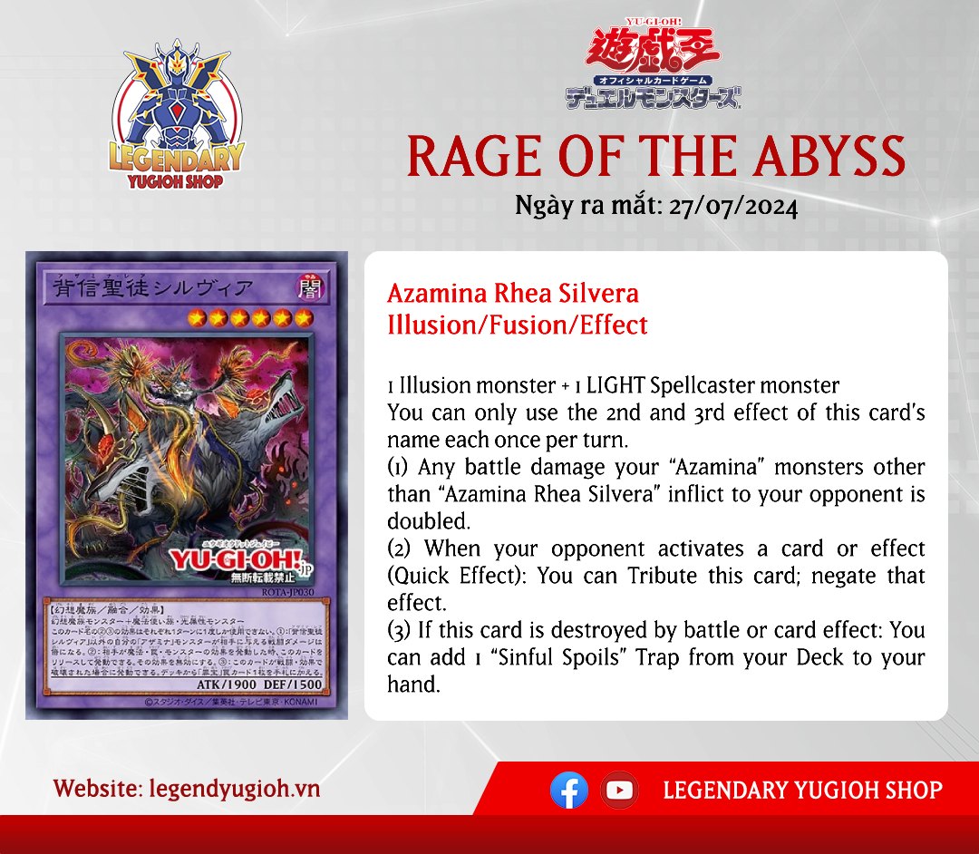 Tiếp tục là một archetype trong lore của Diabellstar, lần này là support trực tiếp cho Sinful Spoils. Các Azamina Spell biết gọi thẳng Azamina Fusion từ Extra bằng cách send Sinful Spoils từ tay/sân xuống Mộ. Các Azamina Fusion thì có thể search Azamina/Sinful Spoils hoặc biết disrupt như negate, bắn phá. Sinful Spoils có lẽ sẽ trở thành archetype chơi độc lập và hứa hẹn còn phát triển hơn nữa.