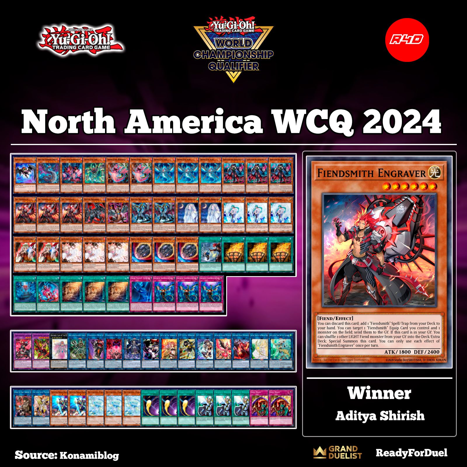 Vượt qua hơn 2600 bài thủ khác, Aditya Dharap đã lên ngôi vô địch NAWCQ 2024 với bộ bài Fiendsmith Snake-Eye. Trong trận chung kết, dù phải đi sau cả 2 game nhưng với việc ném 3-4 handtrap và 1 card combo, anh đã xuất sắc giành chiến thắng trước Michael Thomas (cũng cầm Fiendsmith Snake-Eye). Hai top 4 còn lại là Marshall Demorest (Fiendsmith Yubel) và Landon Oliver (Fiendsmith Snake-Eye). Đây cũng là 4 cái tên cuối cùng của khu vực Bắc Mỹ tham dự World Championship 2024.