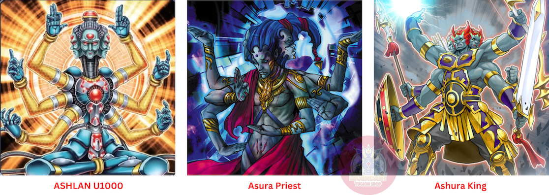 Chúng ta bắt gặp một số hình ảnh của Asura trong Yugioh. Đó chính là AsuraAsura Priest, Ashura King hay mới nhất đó chính là Ashlan U10000 với chuẩn 3 đầu 6 tay như trong những mô tả từ truyền thuyết. Điều đó cho thấy đây chính là 1 trong những thực thể có nhiều nét văn hóa và mang nhiều khát vọng vươn lên, không chịu khuất phục cuộc sống gò bó, ngột ngạt và chật chội trong mỗi chúng ta của đạo Hindu.