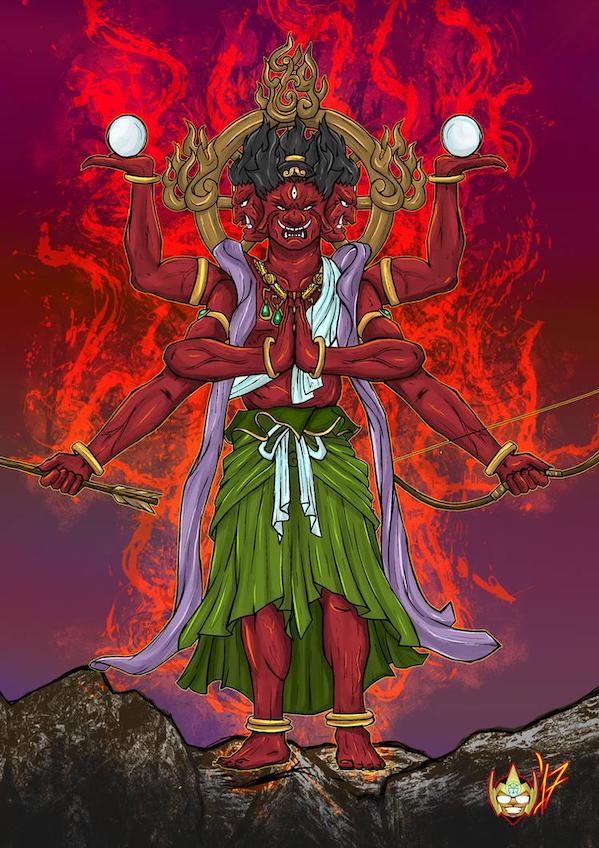 Trong các mô phỏng của các Asura, chúng ta thường nhìn thấy 3 đầu 6 tay, tất nhiên điều đó cũng có những ý nghĩa riêng. Ba cái đầu không chỉ để nhìn nhiều hướng, mà còn biểu trưng cho tam giới: Trời (Devaloka) – nơi của chư thần, Đất (Mortal realm) – nơi con người sinh sống, Địa ngục (Naraka) – nơi bóng tối ngự trị. Trong triết lý Hindu và Phật giáo, người càng mạnh càng phải nhận biết nhiều tầng thực tại. Ba đầu tương ứng với ba khả năng nhận thức, ba góc nhìn: quá khứ – hiện tại – tương lai hoặc thân – khẩu – ý. Sáu tay là hình ảnh hóa của sức mạnh siêu nhiên, vượt khỏi giới hạn con người. Trong chiến đấu: tay nào cũng cầm vũ khí – gươm, chùy, cung, lửa, móc, vòng lửa – thể hiện khả năng chiến đấu đa dạng, toàn diện, không ai địch nổi. Đó cũng có thể là: Lục căn (sáu giác quan) trong Phật giáo: mắt, tai, mũi, lưỡi, thân, ý – tượng trưng cho sự tham đắm mọi thứ, điều đó giải thích rằng Asura chính là hiện thân của dục vọng không đáy.