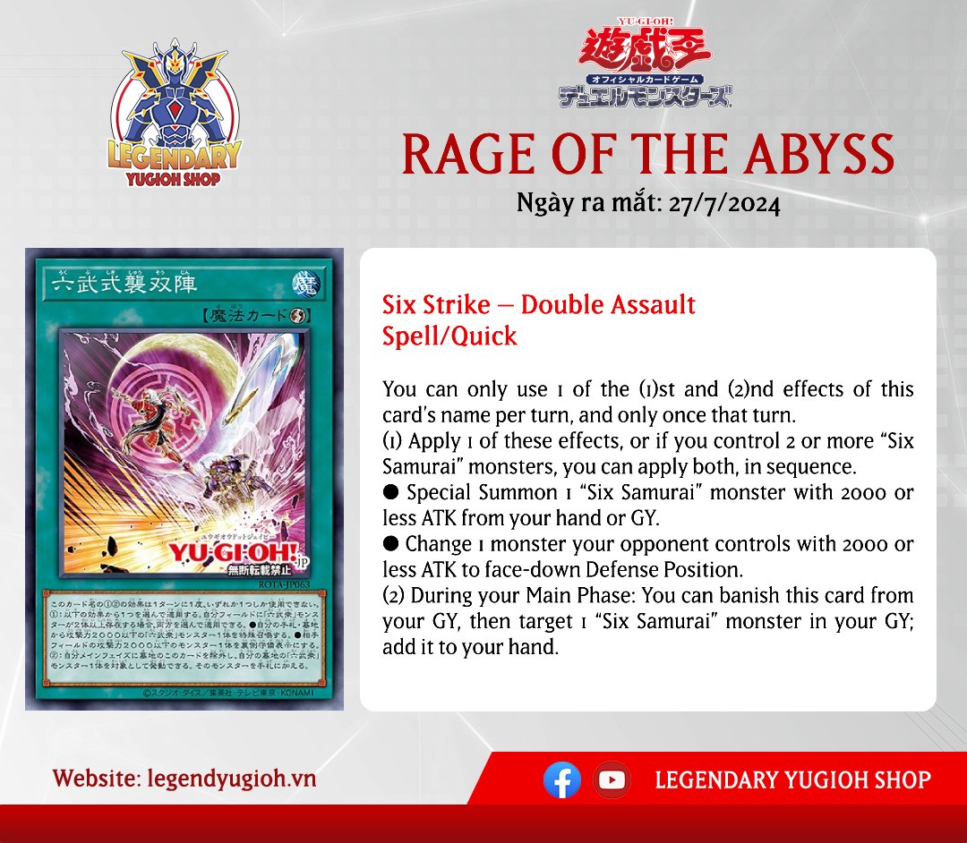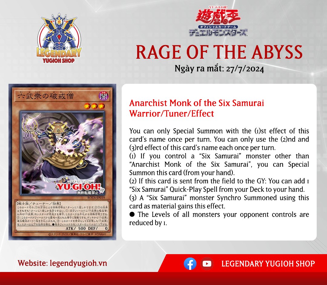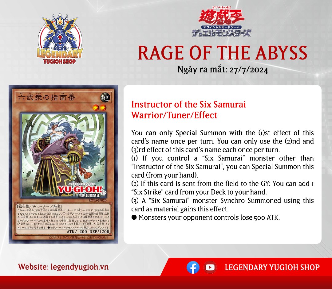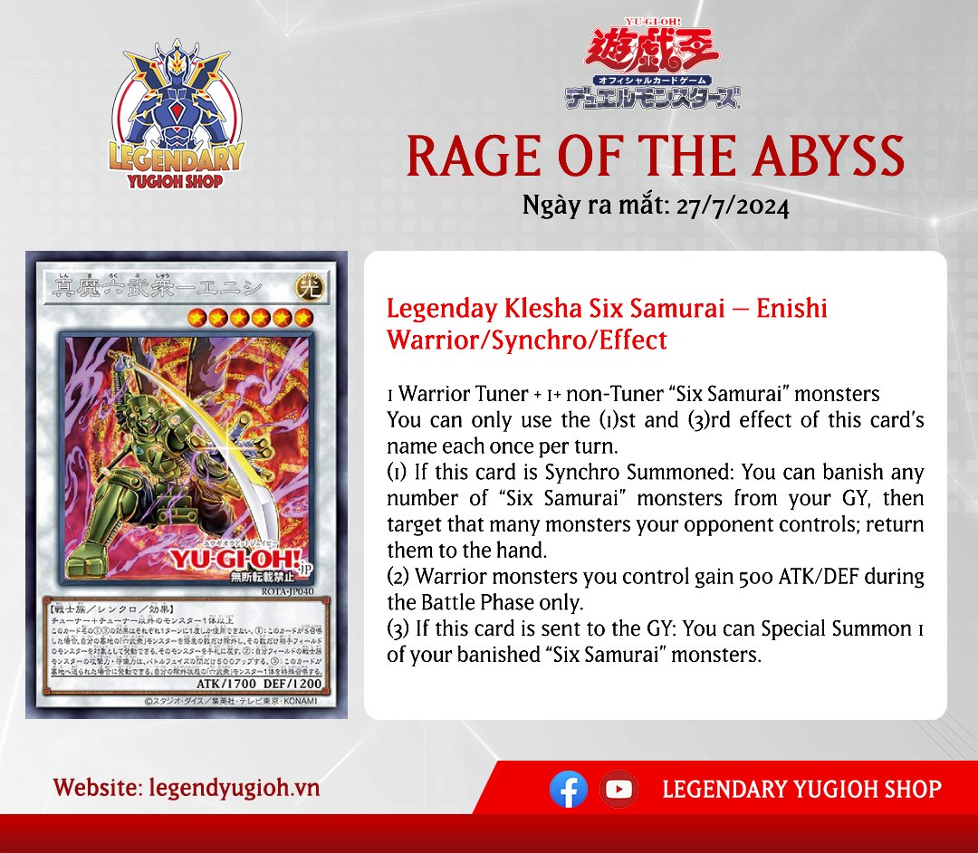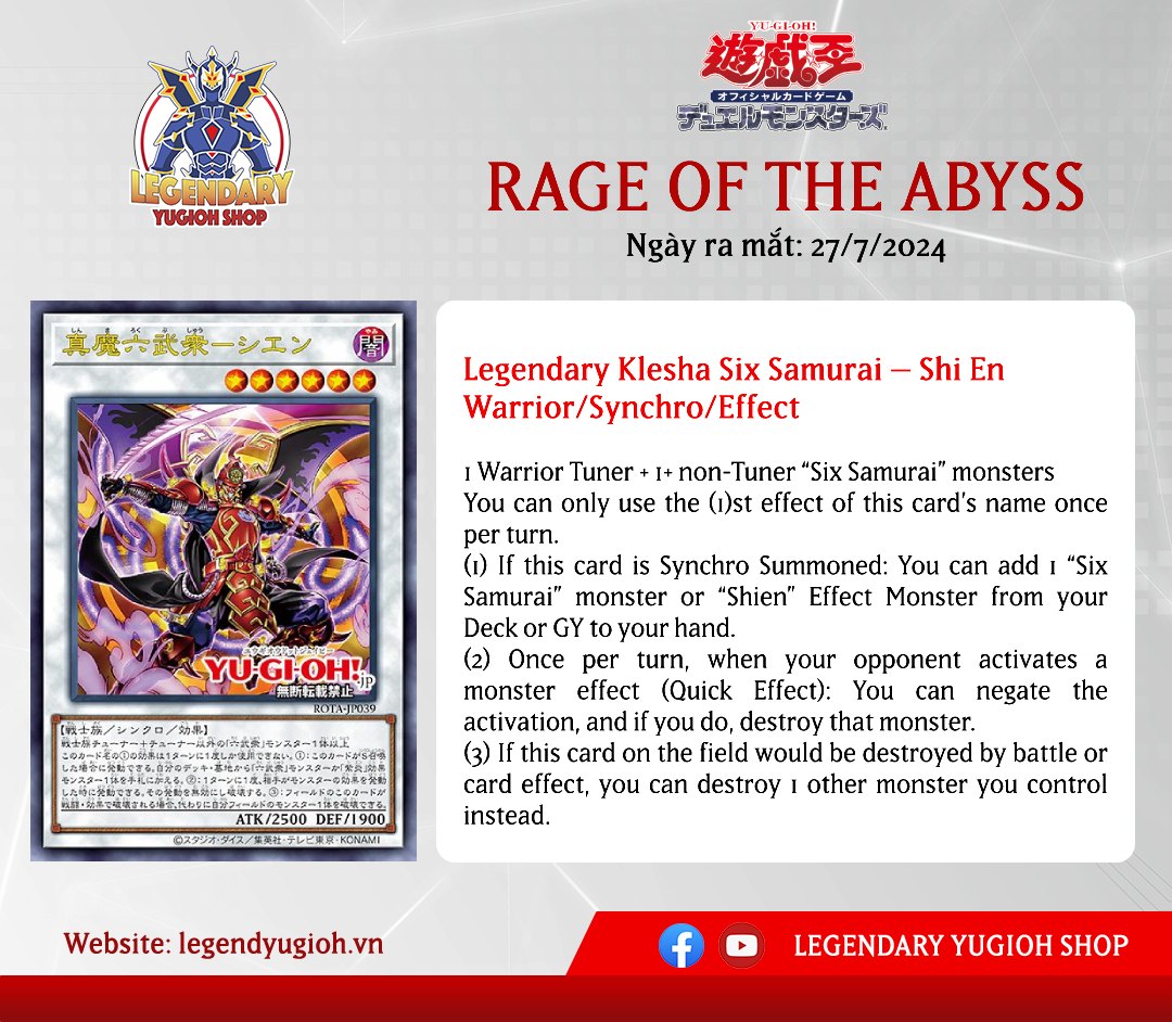 Tộc bài nhiều fan nhất nhì Yu-Gi-Oh! tiếp tục nhận được một đợt support mới trong Rage of the Abyss! Anarchist Monk of the Six Samurai và Instructor of the Six Samurai vừa là extender, vừa có khả năng search rất mạnh mỗi khi được gửi từ field xuống Mộ. Legendary Klesha Six Samurai – Shi En là boss Synchro mới của deck khi biết search nếu được triệu hồi và khả năng negate effect monster, hứa hẹn cùng với Legendary Six Samurai - Shi En trở thành một cặp bài trùng!