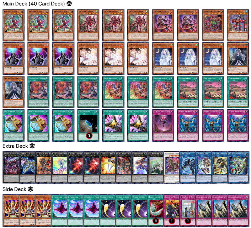 - Crossout Designator là lựa chọn không tệ khi hầu hết khi vào Top chúng ta sẽ gặp các Mirror Match: Fire Kings nên có thể sử dụng Chỉ Kiếm mọi thời điểm. Cuối cùng là Cosmic Cyclone? Trong khi các bộ bài Trap đã không còn chỗ đứng ở Top Tier thì Cosmic Cyclone có lẽ dùng để sử dụng để vượt qua một số Floodgate khó chịu như Summon Limit hay Anti-Spell Fragrance hoặc sử dụng nó dành cho chính Fire Kings Island để phá bàn.
