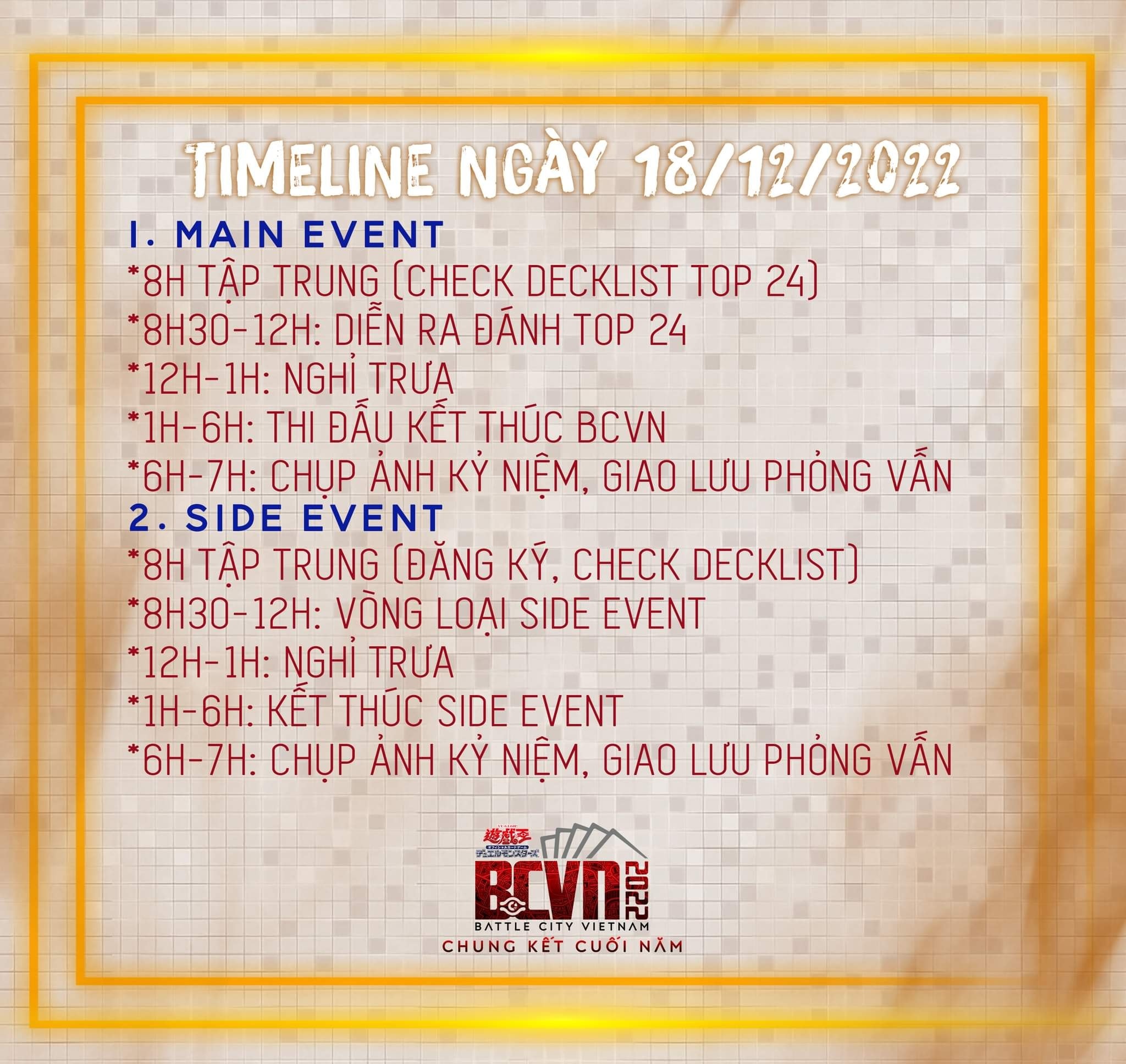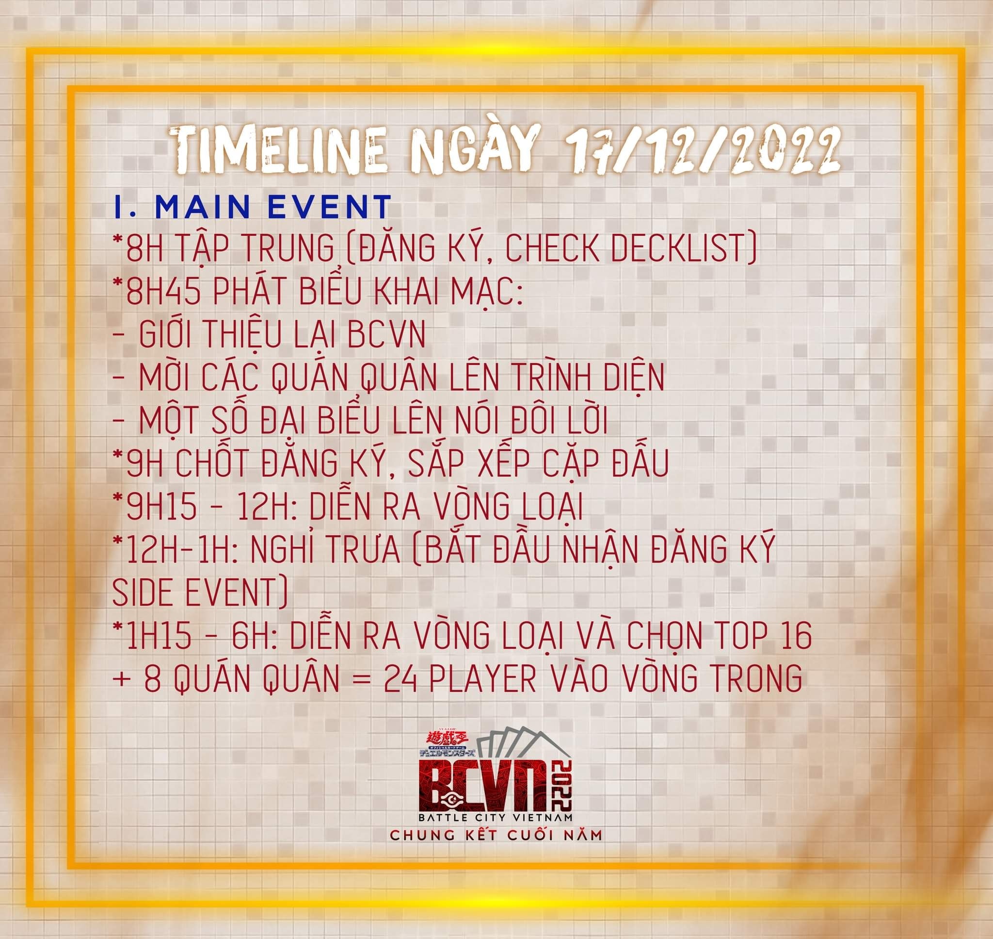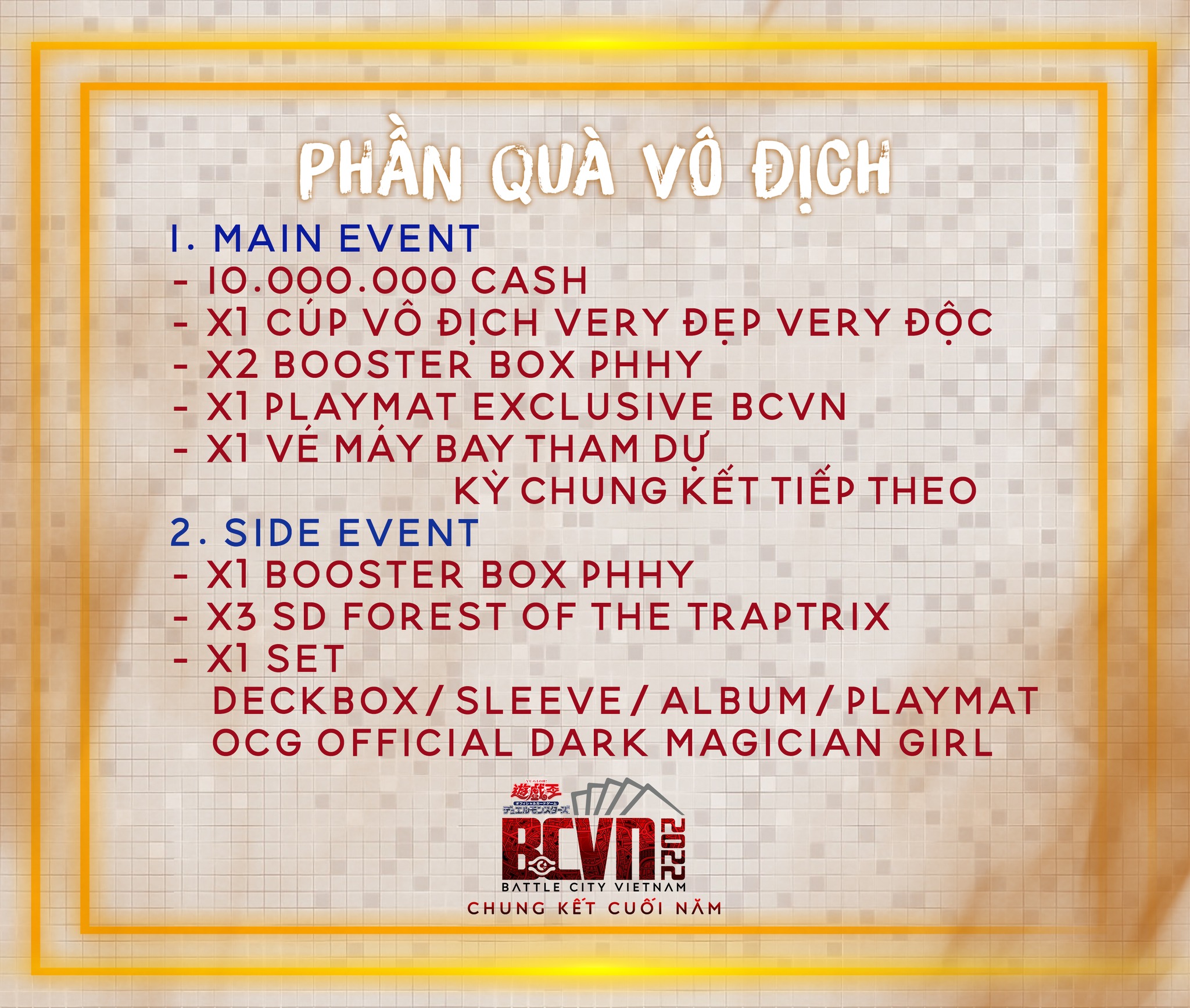 Battle City Vietnam (BCVN) là hệ thống giải đấu tích điểm theo format Official Card Game (OCG) lớn nhất tại Việt Nam. Giải đấu được duy trì từ năm 2019 với hệ thống miền Bắc và miền Nam. Đến năm nay, sau khi trải qua 2 năm đại dịch Covid-19, giải đấu đã thực sự trở lại với quy mô hoành tráng, cùng với lượng bài thủ tăng vọt ghi nhận trong các giải đấu. Giải đấu BCVN năm nay quy tụ thêm một thành viên mới là cửa hàng Team A Plus từ mùa hè 2022 và Yugioh Duel Academy Club bắt đầu từ cuối năm 2022.