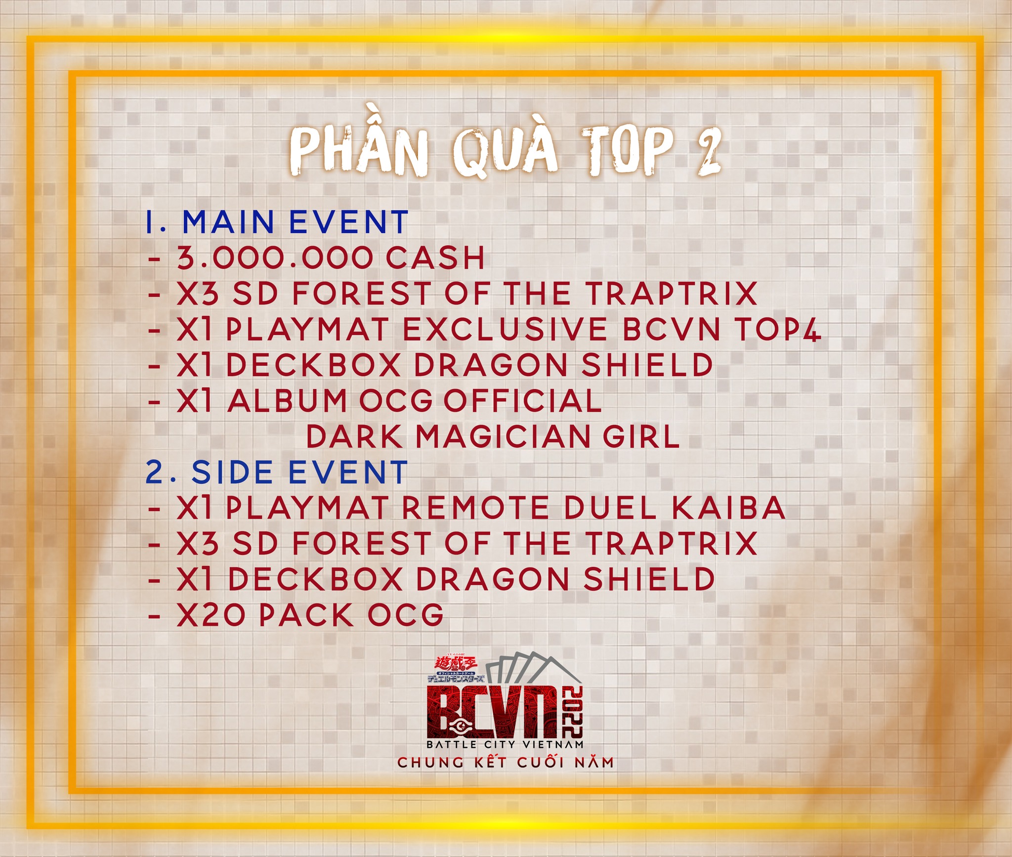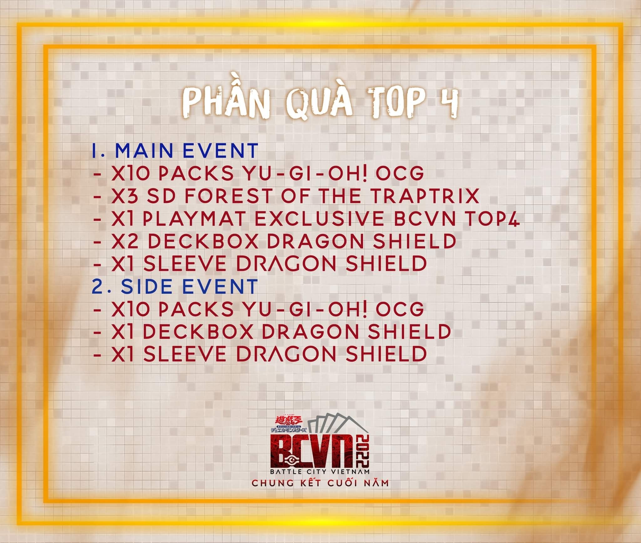 Bên cạnh đó, phần thưởng cho vé vào cửa và Give away may mắn cũng được tổ chức đầy đủ nhằm thu hút các bài thủ và các người hâm hộ Yugioh khắp cả nước.
