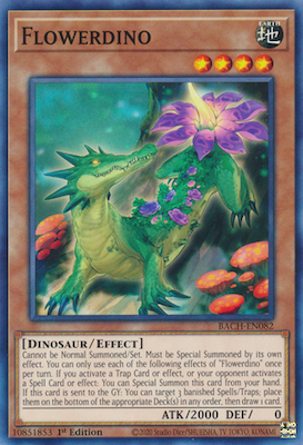 Lá bài của cùng được thảo luận sẽ là chú khủng long Flowerdino được ra mắt đặc biệt ở TCG. Flowerdino là một sự bổ sung tuyệt vời cho những chiến thuật sử dụng nhiều bài bẫy. Nó là một con khủng long với sức tấn công 2000, không thể Triệu hồi Bình thường hay Úp, chỉ có thể được Triệu hồi Đặc biệt bằng chính khả năng của mình, thứ sẽ kích hoạt khi người chơi kích hoạt (sử dụng) hiệu ứng của bài bẫy hoặc khi đối thủ kích hoạt (sử dụng) hiệu ứng bài ma pháp.