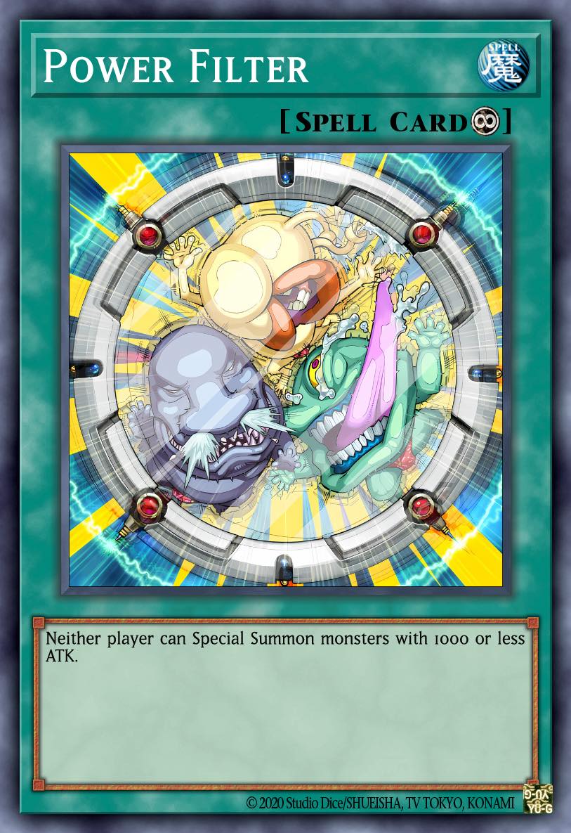 Khả năng của Power Filter rất đơn giản: Cả 2 người chơi không được triệu hồi đặc biệt quái thú có ATK từ 1000 trở xuống. Vô tình 2 Meta top đầu hiện tại là Snake-Eye và Yubel đều rất phụ thuộc vào những quái thú có sức công thấp. Nếu không có sẵn S/T removal, cả 2 bộ bài này đều cực kì khó triển khai lối chơi khi không thể chạm vào Poplar, các Yubel hay cả Fiendsmith engine (Lurrie và Requiem).