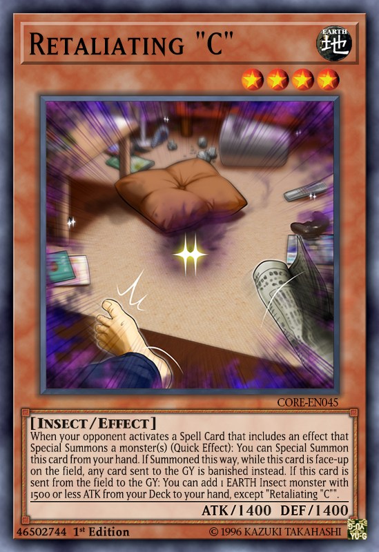 Retaliating “C" sẽ được triệu hồi ngay khi khi đối thủ sử dụng một Spell biết gọi quái thú, sau đó Continuous Effect trên sân không khác gì một floodgate tương tự như Dimension Shifter. Lá bài này được sử dụng khá nhiều gần đây bởi có thể counter engine Azamina trong Snake-Eye hiệu quả.